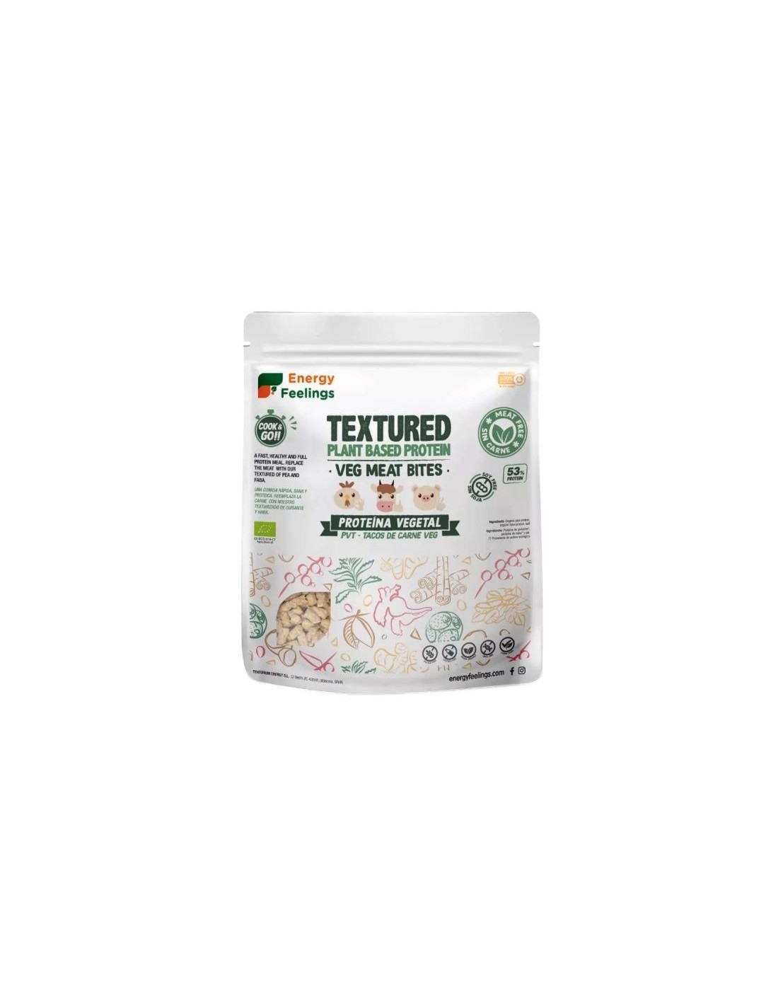 ENERGY FEELINGSProteína vegetal texturizada, en formato dados (bites), trozos homogéneos deshidratados, con sabor ligeramente salado que aderezado semeja carne. Alternativa a las proteínas de origen animal. Sin Soja. Muy bajo índice glucémico. Fuente de proteínas 53 %. Las proteínas contribuyen a que aumente la masa muscular. Con certificación ecológica /producido en Europa. Libre de tóxicos, sometida a rigurosos controles de calidad. Sin alérgenos (sin gluten, vegano, BIO, sin azúcar, sin saborizantes artificiales). Sin procesamiento de productos químicos.