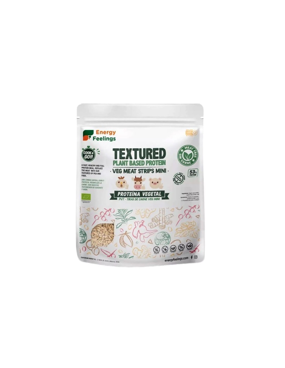 ENERGY FEELINGSProteína vegetal texturizada, con sabor ligeramente salado que aderezado semeja carne. Alternativa a las proteínas de origen animal. Sin Soja. Muy bajo índice glucémico. Fuente de proteínas 53 %. Las proteínas contribuyen a que aumente la masa muscular. Con certificación ecológica /producido en Europa. Libre de tóxicos, sometida a rigurosos controles de calidad. Sin alérgenos (sin gluten, vegano, BIO, sin azúcar, sin saborizantes artificiales). Sin procesamiento de productos químicos.