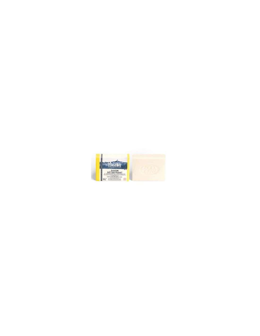 LA CORVETTEProducto para limpiar y descalcificar. Apto para una variedad de superficies. 1 x 200g jabón sólido = 2 x 500ml botella de detergente líquido. Garantiza la limpieza profunda sin dañar el medio ambiente. Packaging de papel con certificación FSC. Sin aceite de palma. EcoCert.
