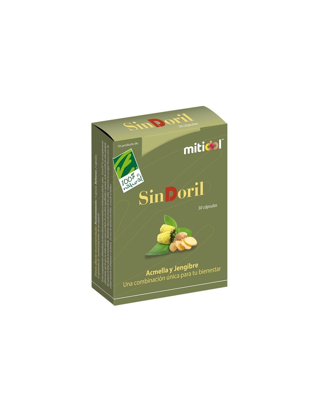 CIEN POR CIEN NATURALSinDoril, es un complemento alimenticio a base de Mitidol®, combinación única de dos extractos estandarizados de plantas de uso tradicional ampliamente estudiados: Acmella (Acmella oleracea (L.) R.K. Jansen) y Jengibre (Zingiber officinale Roscoe). El jengibre ayuda en el control de la respuesta inflamatoria. Los ingredientes que conforman la formulación de SinDoril (Mitidol®) han sido ampliamente estudiados, sin embargo, gracias a los estudios clínicos realizados con la combinación de ambos ingredientes, se ha podido ver cómo la actividad de las dos plantas se han visto incrementadas en relación de la actividad independiente\ de cada planta. Mitidol® cuenta con 2 estudios clínicos y un estudio un vitro que muestra su mecanismo de acción.
