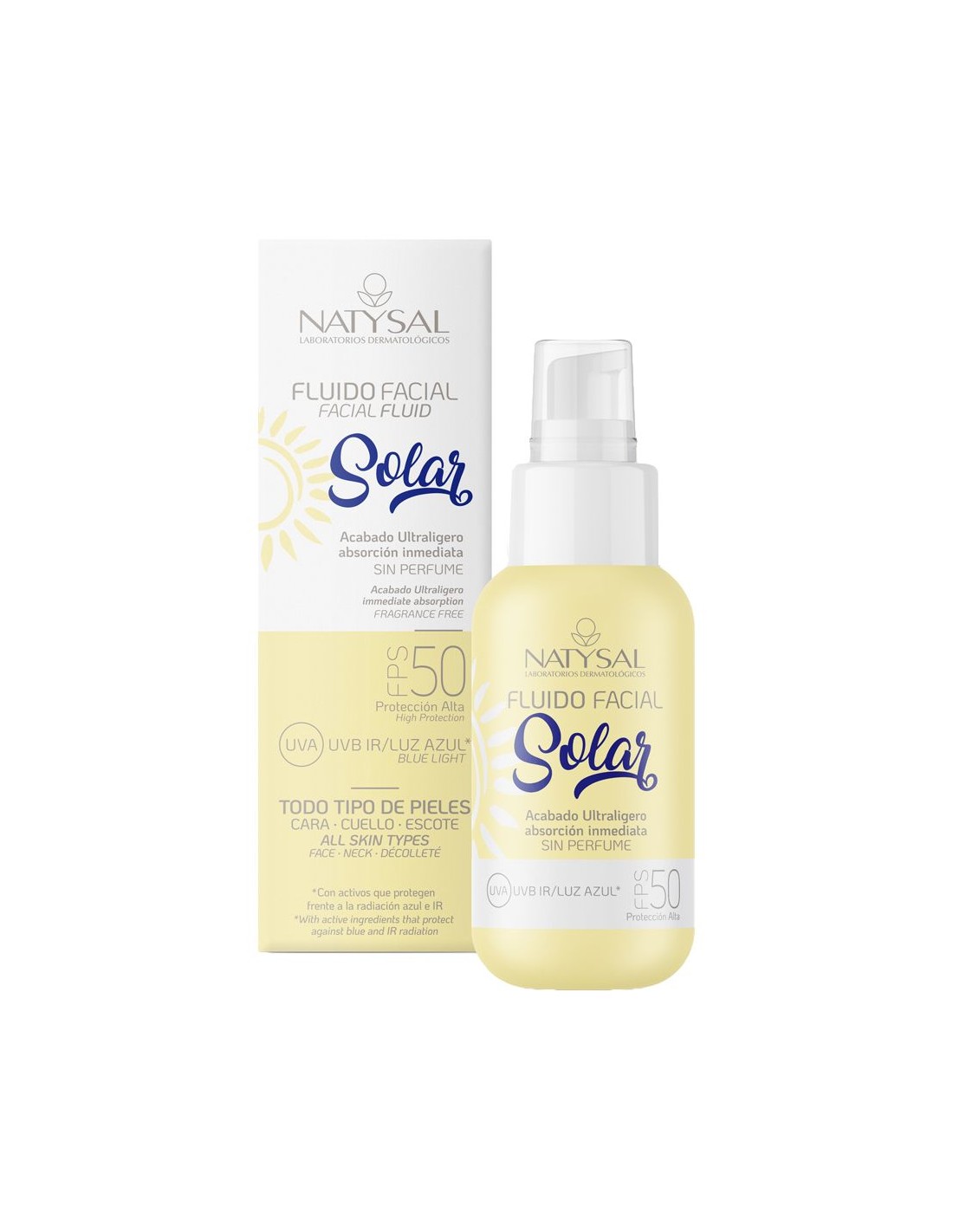 Fluido facial solar FPS 50 Protección Alta de acabado ultraligero para todo tipo de pieles. Con activos que protegen frente a la radiación infrarroja y luz azul. UVA-UVB IR/LUZ AZUL. Tacto ligero. PMMA free (sin microplásticos). Sin nanopartículas. Resistente al agua. Alta tolerancia a pieles sensibles. Sin alcohol. Sin perfume. Dermatológicamente testado.
