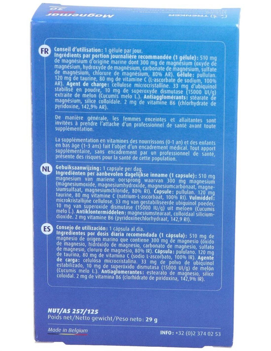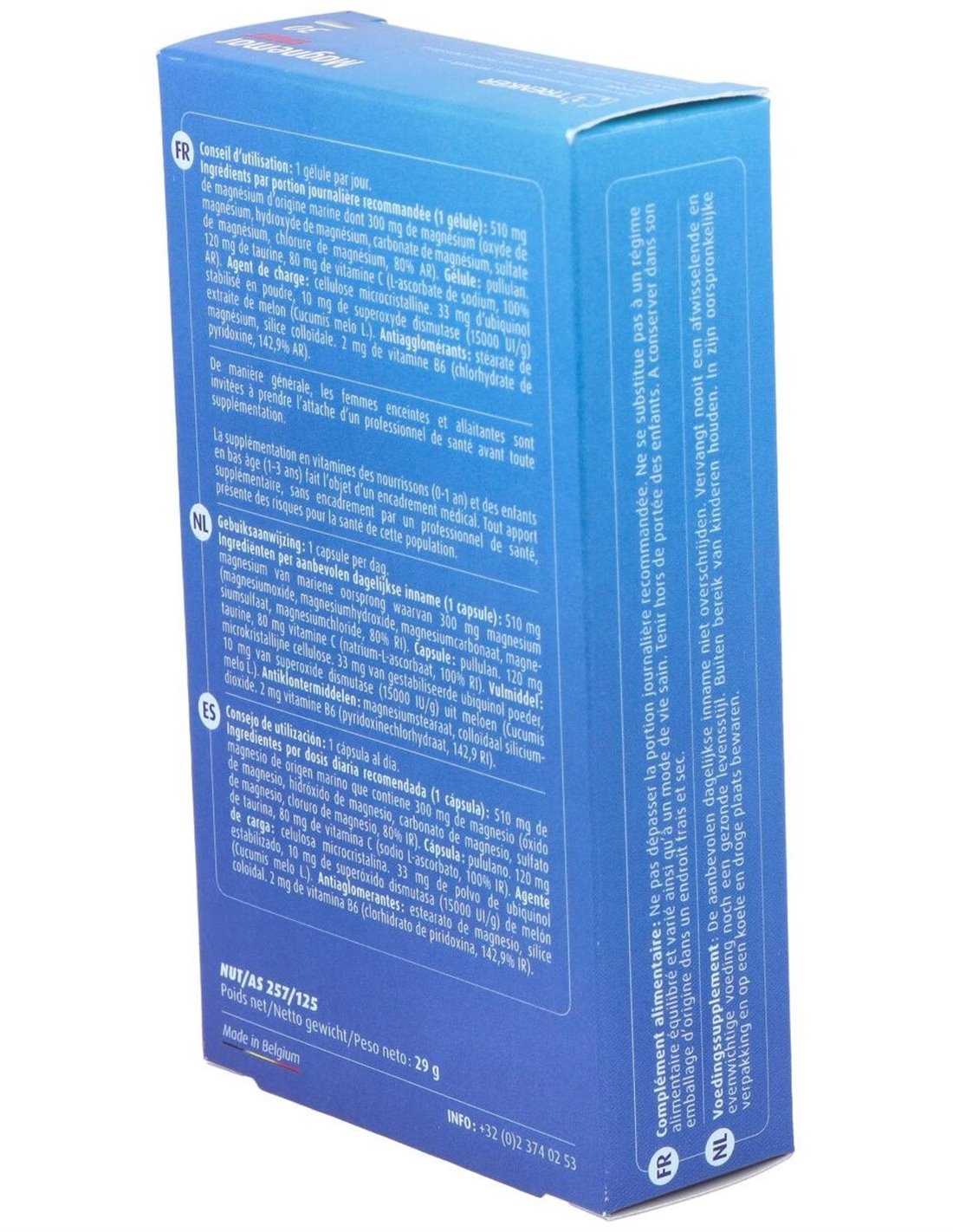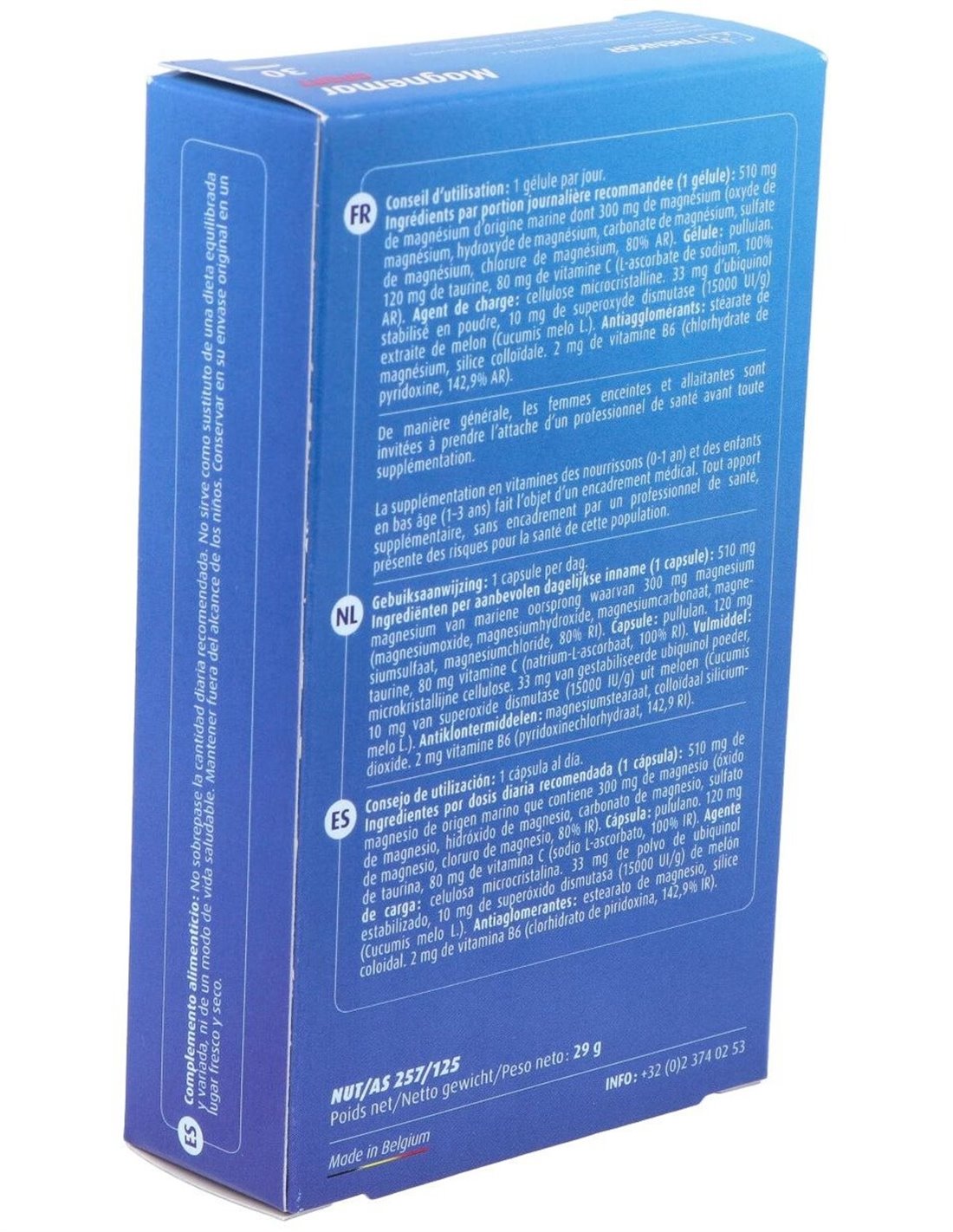 Magnesio marino completo, Magnesio elemento, Taurina, Vitamina C, Ubiquinol en polvo, Superóxido de dismutasa, Vitamina B6.