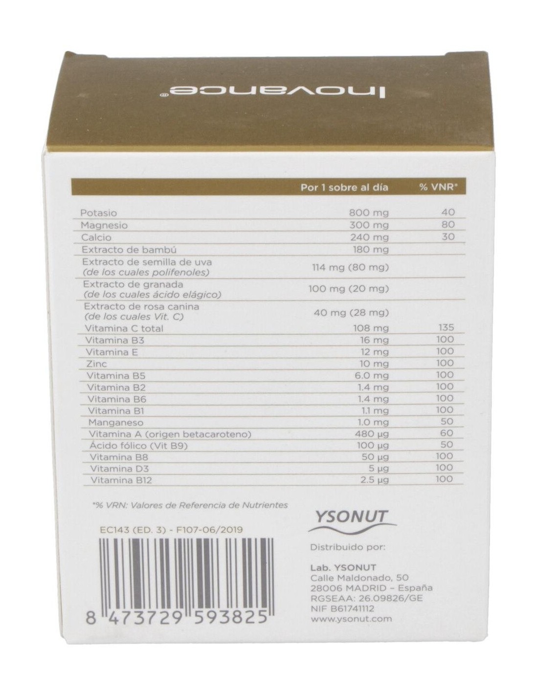 Citrato de potasio: citrato de magnesio: citrato de calcio: lactato de calcio: acidulante (ácido cítrico): aroma natural: extracto de bambú (Bambusa arundinacea): extracto de semillas de uva (Vitis vinifera): extracto de granada (Punica granatum): acidulante (ácido málico): ácido L-ascórbico: edulcorante (acesulfamo K): maltodextrina: extracto de rosa silvestre (Rosa canina): acetato de DL-alfa tocoferilo (vitamina E): sulfato de zinc: edulcorante (sucralosa): nicotinamida (vitamina PP/B3): betacaroteno (vitamina A): D-pantotenato cálcico (vitamina B5): sulfato de manganeso: colecalciferol (vitamina D3): clorhidrato de piridoxina (vitamina B6): riboflavina (vitamina B2): clorhidrato de tiamina (vitamina B1): antiaglomerante (dióxido de silicio): ácido pteroilmonoglutámico (vitamina B9): D-biotina (vitamina B8): cianocobalamina (vitamina B12).