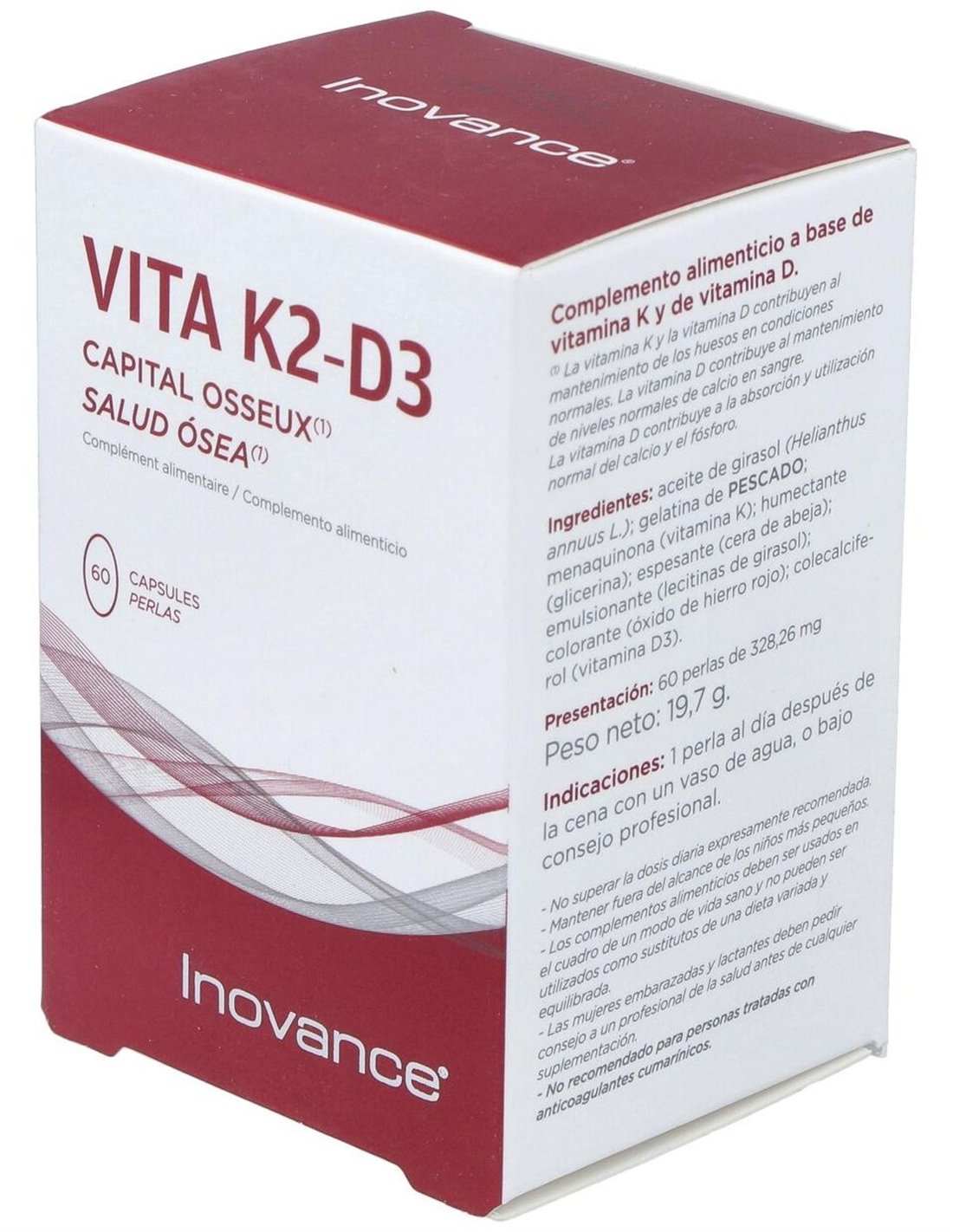Inovance Vita K2 D3 Salud Ósea 60caps es un complemento alimenticio que contribuye a la salud normal de los huesos, gracias a su fórmula rica en vitaminas K y D.