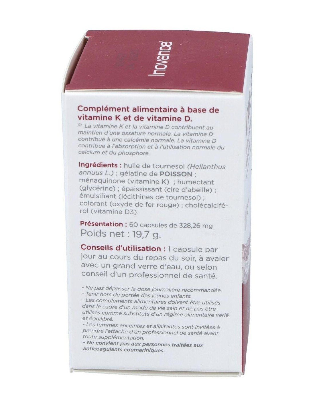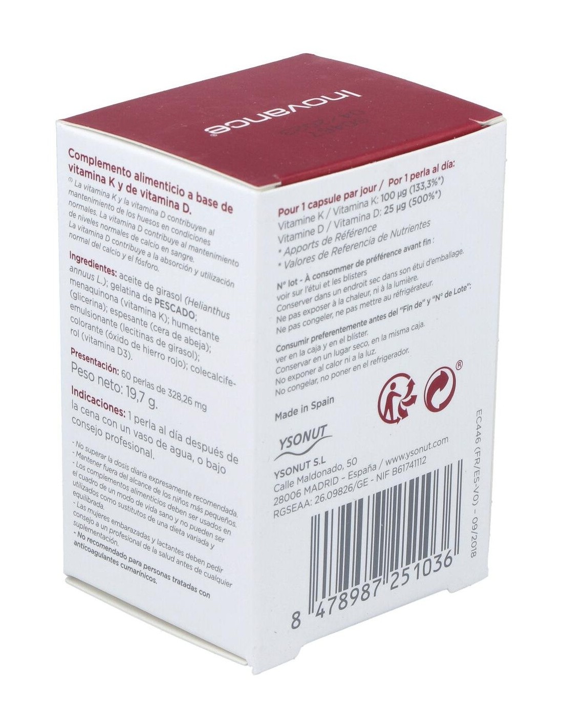 Aceite De Girasol, Gelatina Fish, Menaquinona-7 (Vitamina K2), Humectante (Glicerina), Espesante (Cera De Abejas), Emulsionante (Lecitina De Girasol), Colorante (Óxido De Hierro Rojo), Colecalciferol (Vitamina D3).