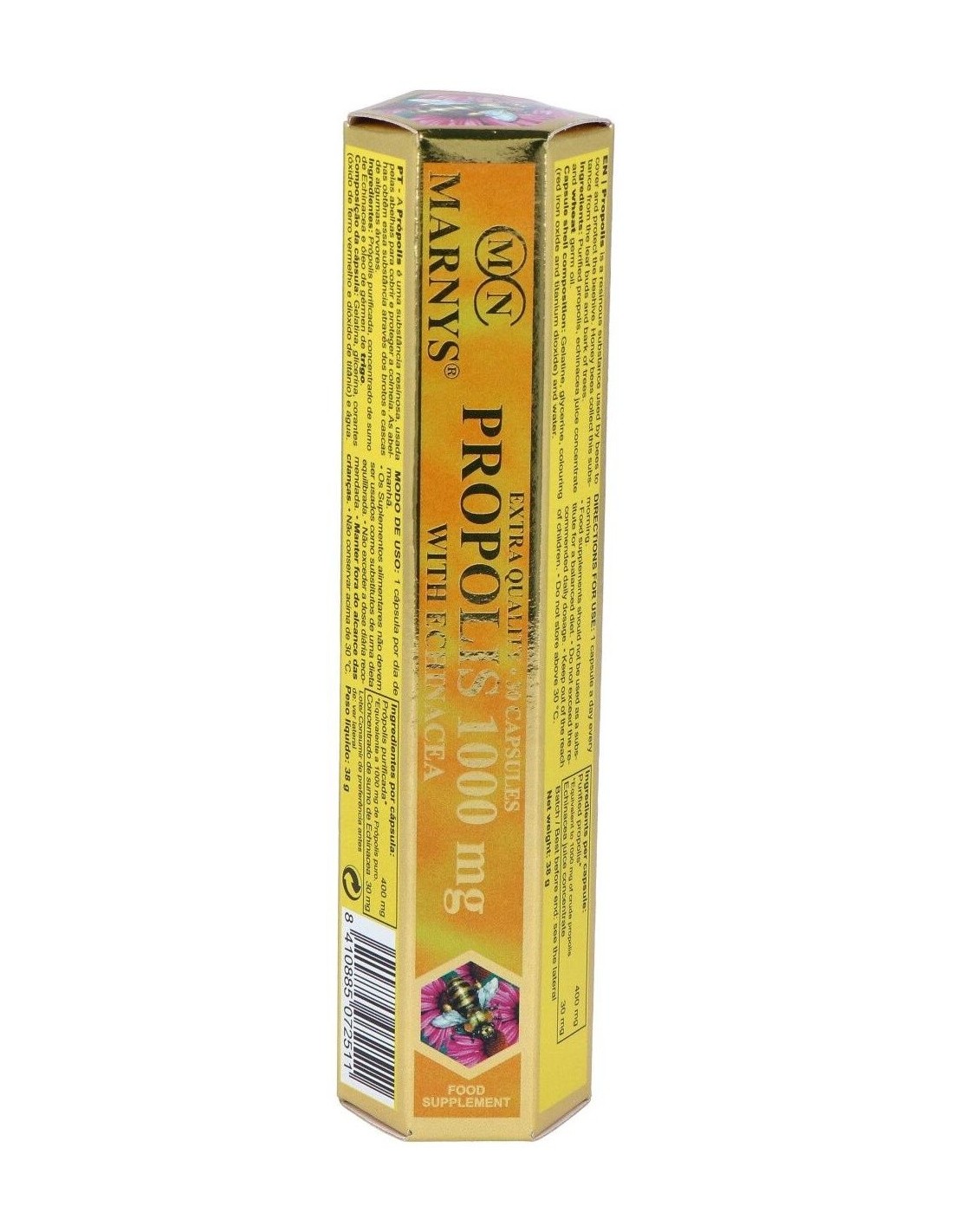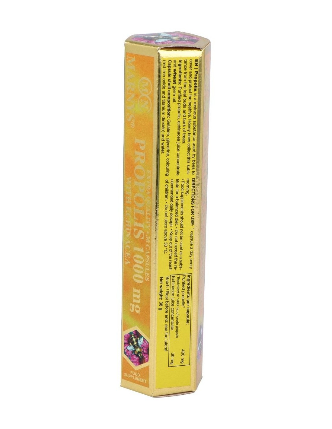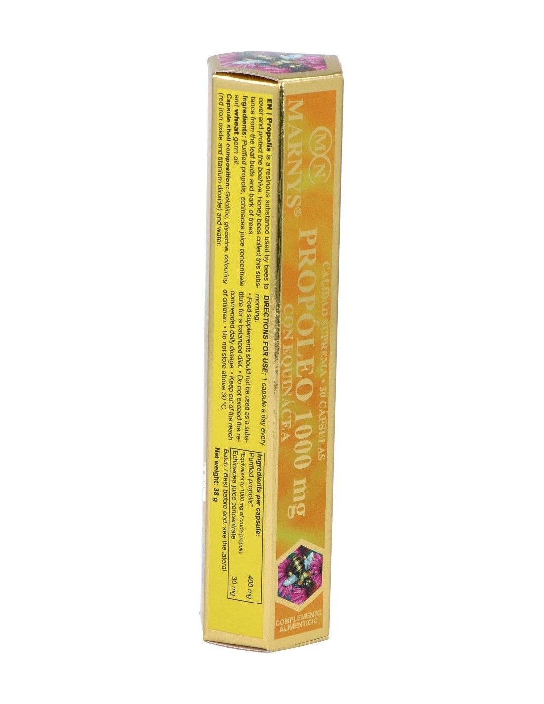 Propóleo purificado (400 mg/cap 'equivalente a 1000 mg de propóleo crudo/cap'), concentrado de jugo de equinácea y aceite de germen de trigo. Composición de la cápsula: gelatina, glicerina, colorantes (óxido de hierro rojo y dióxido de titanio) y agua.