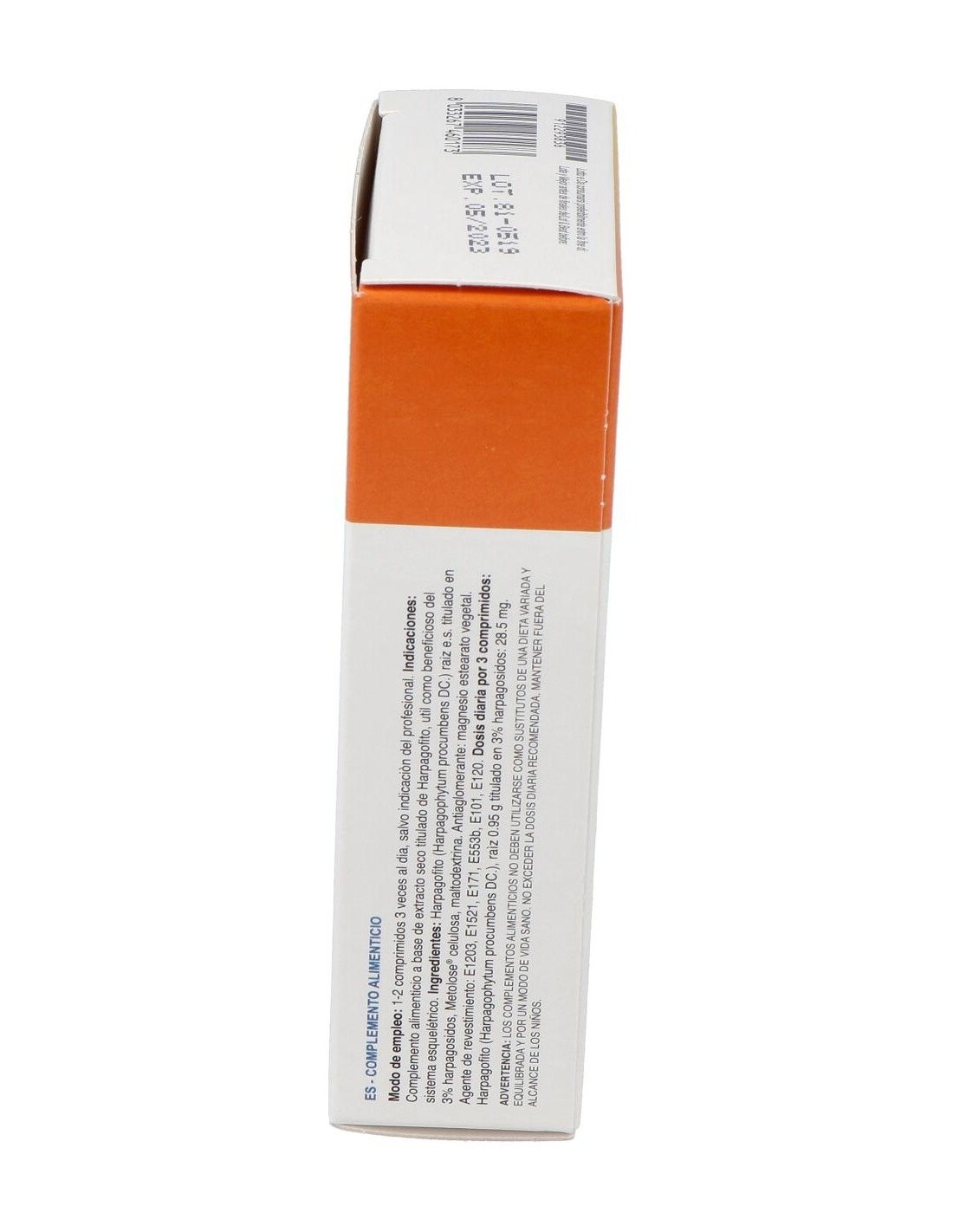 Harpagofito, raíz e.s. titulado en 3% harpagosidos, metolose, celulosa, maltodextrina, antiglomerantes: dióxido de silicio, magnesio estereato vegetal, agente de revestimiento: amido acetilado, talco, glicerol, colorante E129 y E102.