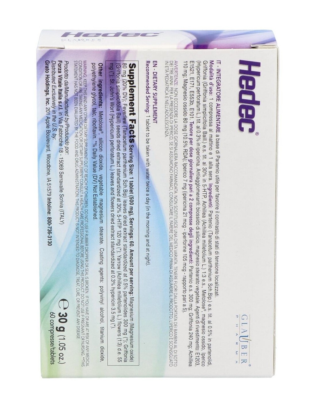 Altamisa (Tanacetum partenium) e.s. tit. 0,5% partenolides, Griffonia (Griffonia simplicifolia) e.s. tit. 30% 5-HTP, Milenrama (Achillea millefolium)(1:3) e.s., Metolose®, magnesio oxido, Hipérico (Hypericum perforatum) e.s. tit. 0,3% in hypericina: Antiaglomerantes: diòxido de silicio, estearato de magnesio vegetal. Recubrimientos: almidòn acetilado (E1420), talco, glicerol, colorantes (E132)