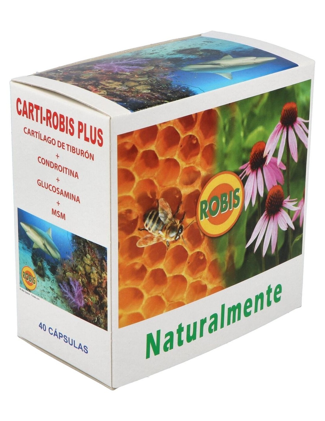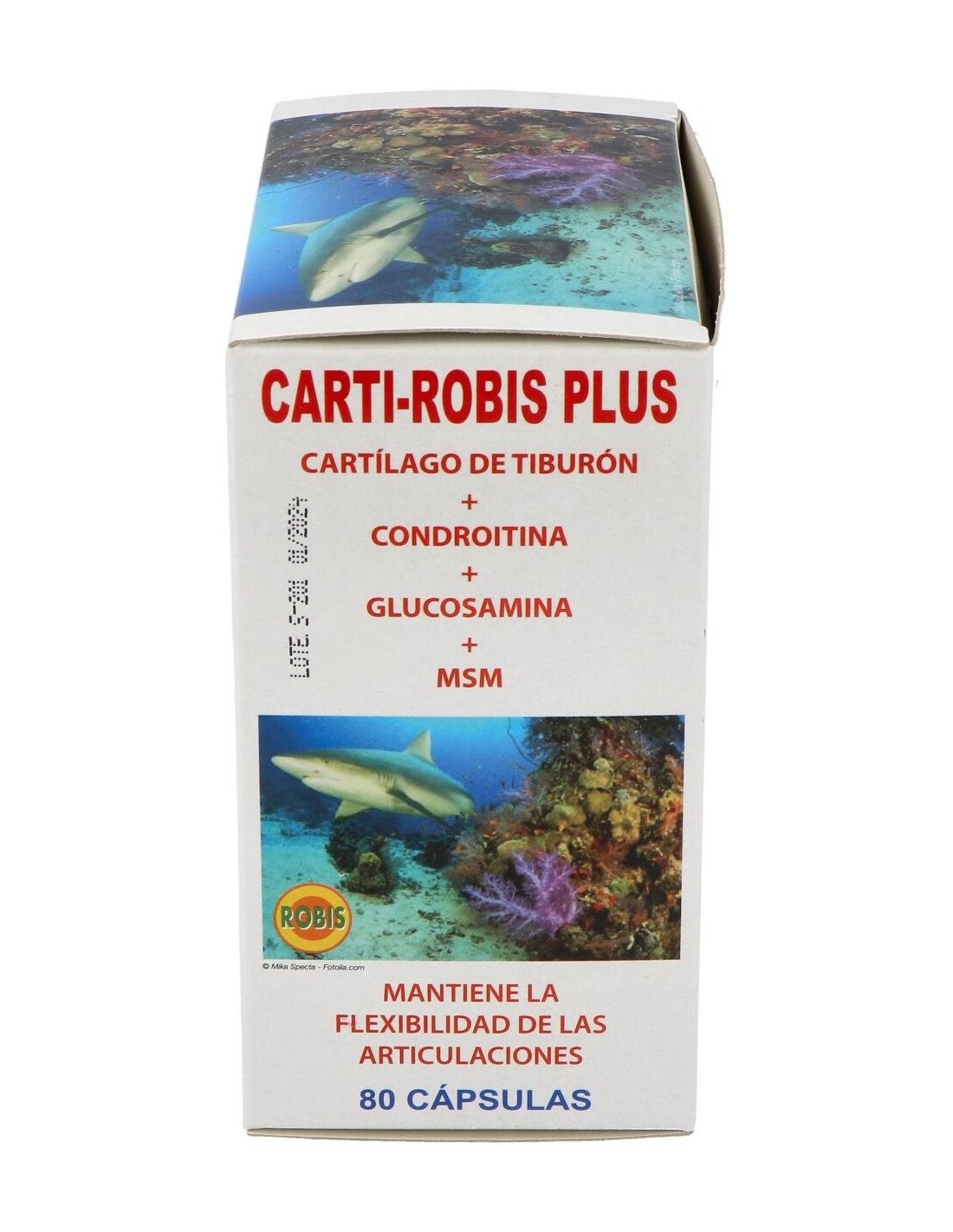 Cartílago de tiburón, Condroitín sulfato, Glucosamina sulfato, MSM (Metil sulfonil metano), magnesio estearato (antiaglomerante) y gelatina (envoltura).