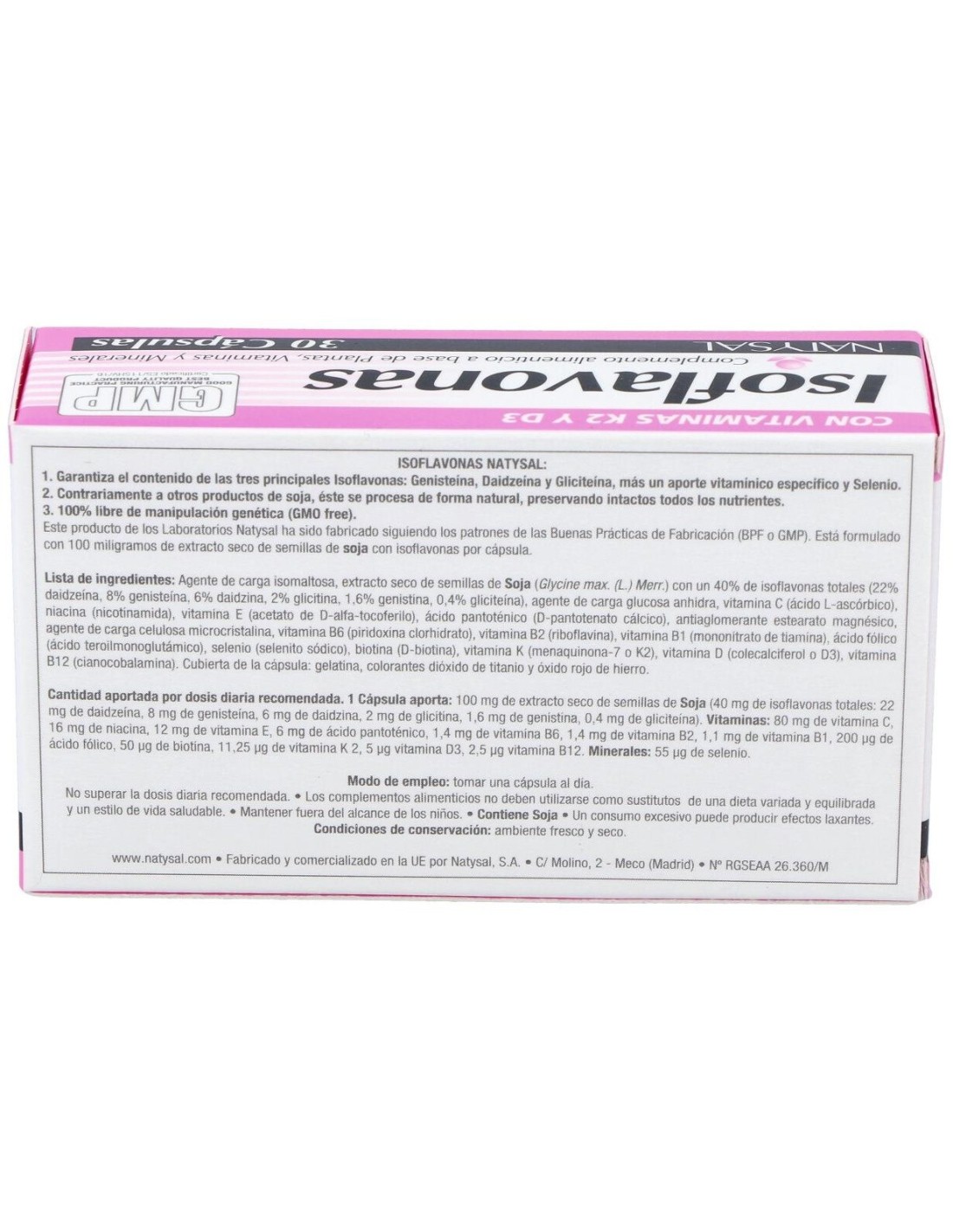 Agente de carga isomaltosa, extracto seco de semillas de Soja (Glycine max. (L.) Merr.) con un 40% de isoflavonas totales (22% daidzeína, 8% genisteína, 6% daidzina, 2% glicitina, 1,6% genistina, 0,4% gliciteína), agente de carga glucosa anhidra, vitamina C (ácido L-ascórbico), niacina (nicotinamida), vitamina E (acetato de D-alfa-tocoferilo), ácido pantoténico (D-pantotenato cálcico), antiaglomerante estearato magnésico, agente de carga celulosa microcristalina, vitamina B6 (piridoxina clorhidrato), vitamina B2 (riboflavina), vitamina B1 (mononitrato de tiamina), ácido fólico (ácido teroilmonoglutámico), selenio (selenito sódico), biotina (D-biotina), vitamina K (menaquinona-7 o K2), vitamina D (colecalciferol o D3), vitamina B12 (cianocobalamina). Cubierta de la cápsula: gelatina, colorantes dióxido de titanio y óxido rojo de hierro.