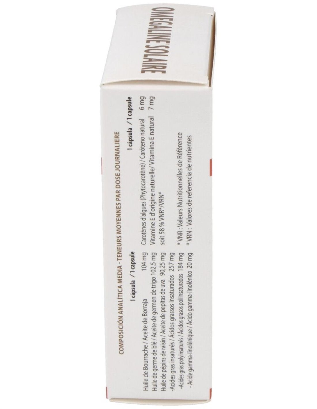 Aceite de borraja virgen de primera presión en frío, extracto natural de algas ricas en betacaroteno, aceite de germen de trigo, aceite de soja, vitamina E natural.