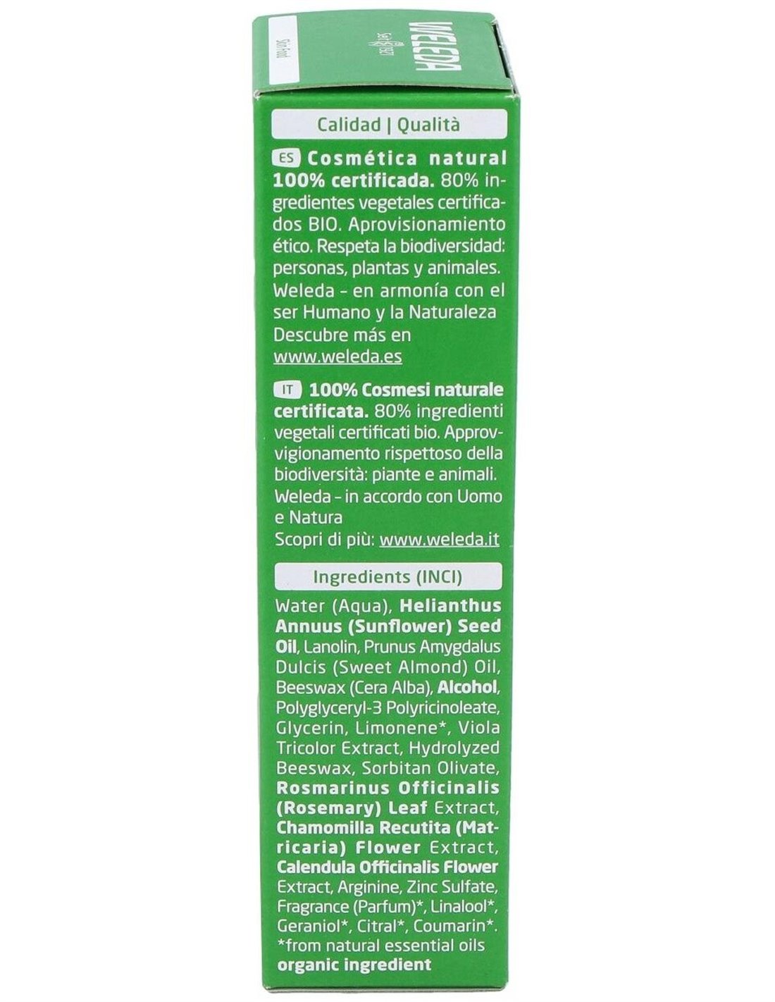 Agua, aceite de girasol, lanolina, aceite de almendra dulce, alcohol, cera de abeja, gliceril linoleato (emulgente natural obtenido de aceites vegetales), cera de abeja hidrolizada, aceites esenciales naturales, extracto de pensamiento silvestre, extracto de hojas de romero, de manzanilla, de caléndula.