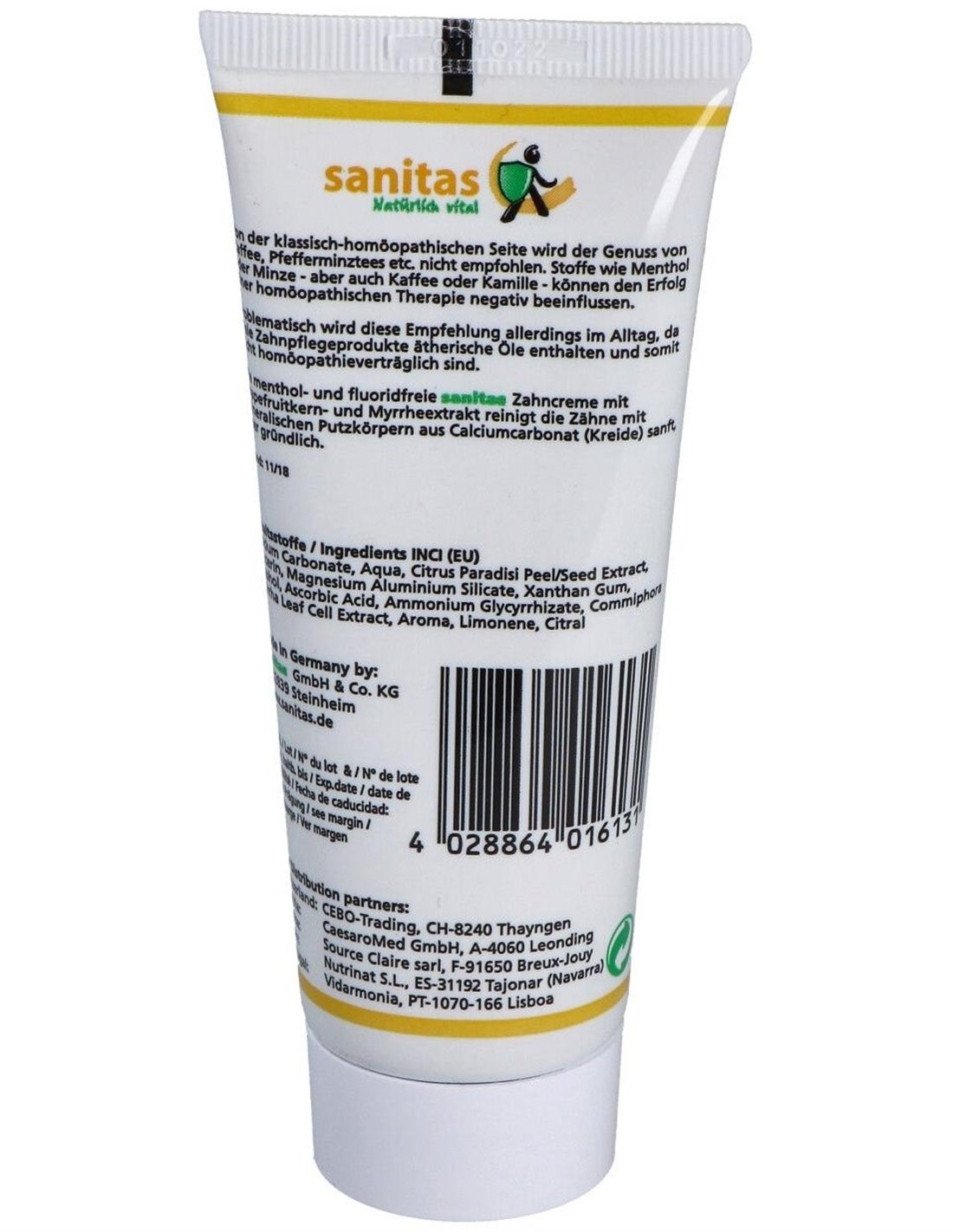 Dentífrico para la higiene bucal y el cuidado de las encías con extracto de semilla de pomelo (Citrus paradisi) y extracto de mirra (Commiphora myrrha), de agradable sabor y libre de parabenos. Dentífrico compatible con la homeopatía.