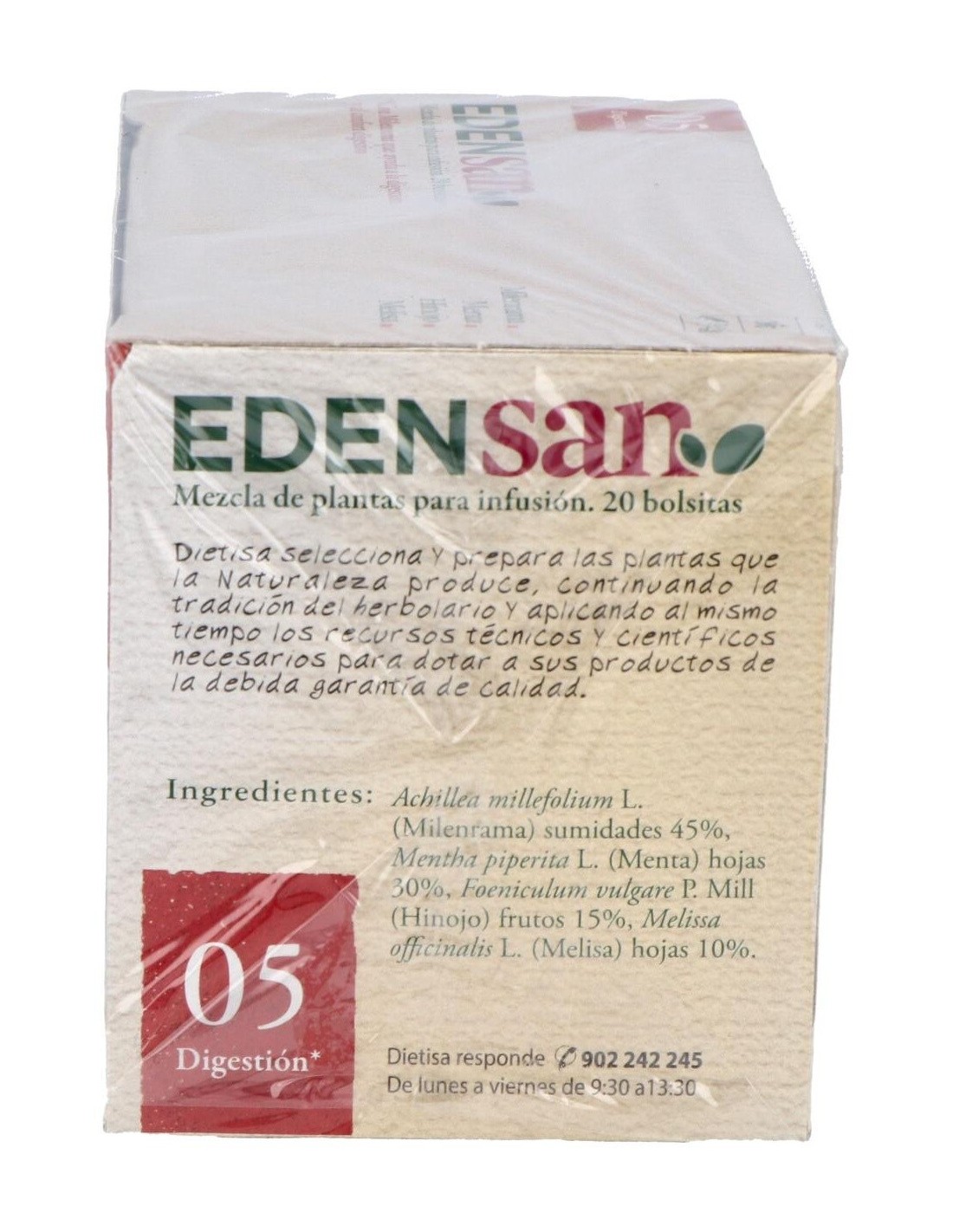 Edensan digestión 05 de Dietista mezcla diversas plantas con las que se obtiene una infusión con prodiedades digestivas. Su composición está realizada a base de milenrama, menta, hinojo y melisa.