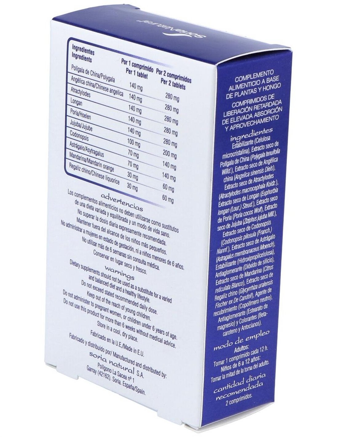 Estabilizante (Celulosa microcristalina), Extracto seco de Polígala de China (Polygala tenuifolia Willd.), Extracto seco de Angélica china (Angelica sinensis Diels), Extracto seco de Atractylodes (Atractylodes macrocephala Koidz.), Extracto seco de Longan (Euphorbia longan (Lour.) Steud.), Extracto seco de Poria (Poria cocos Wolf), Extracto seco de Jujuba (Ziziphus jujuba Mill.), Extracto seco de Codonopsis (Codonopsis pilosula (Franch.) Nannf.), Extracto seco de Astrágalo (Astragalus membranaceus Moench), Estabilizante (Hidroxipropilcelulosa), Antiaglomerante (Dióxido de silicio), Extracto seco de Mandarina (Citrus reticulata Blanco), Extracto seco de Regaliz chino (Glycyrrhiza uralensis Fischer ex De Candoll), Agente de recubrimiento (Copolímero neutro), Antiaglomerante (Estearato de magnesio) y Colorantes (Beta-caroteno y Antocianos).