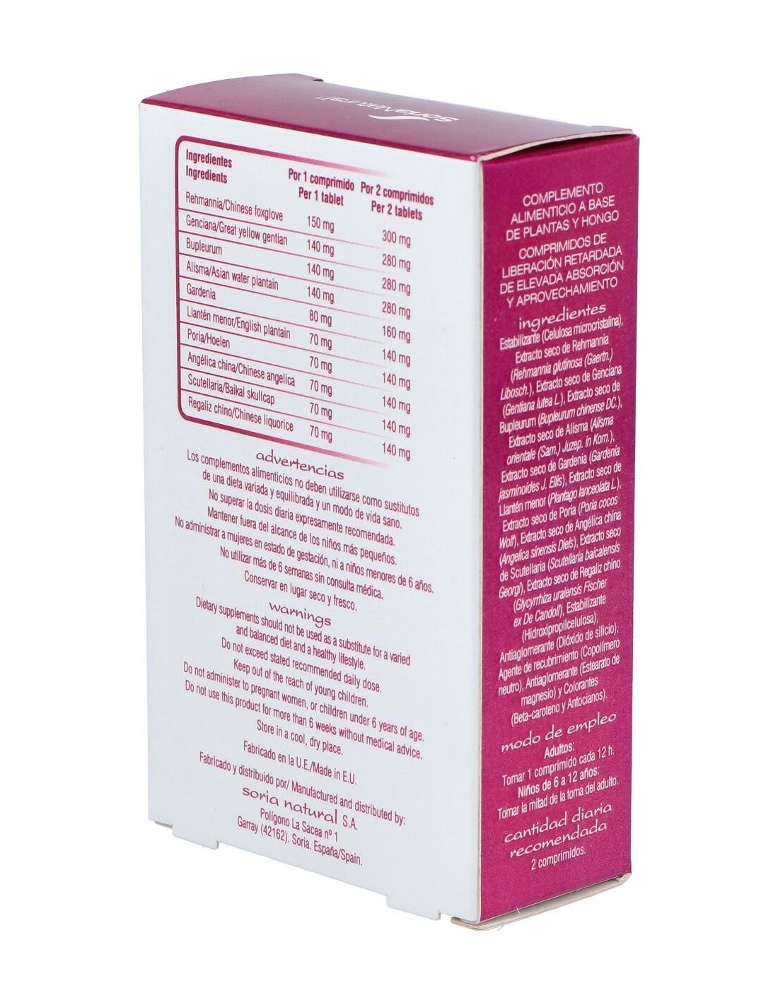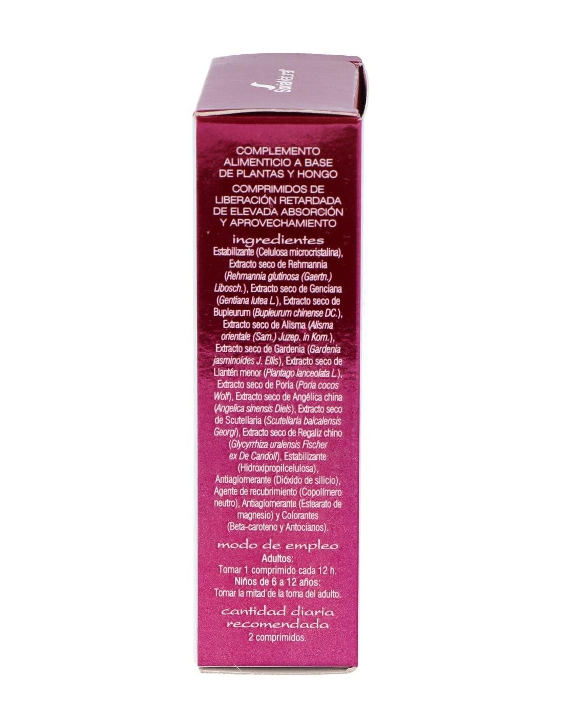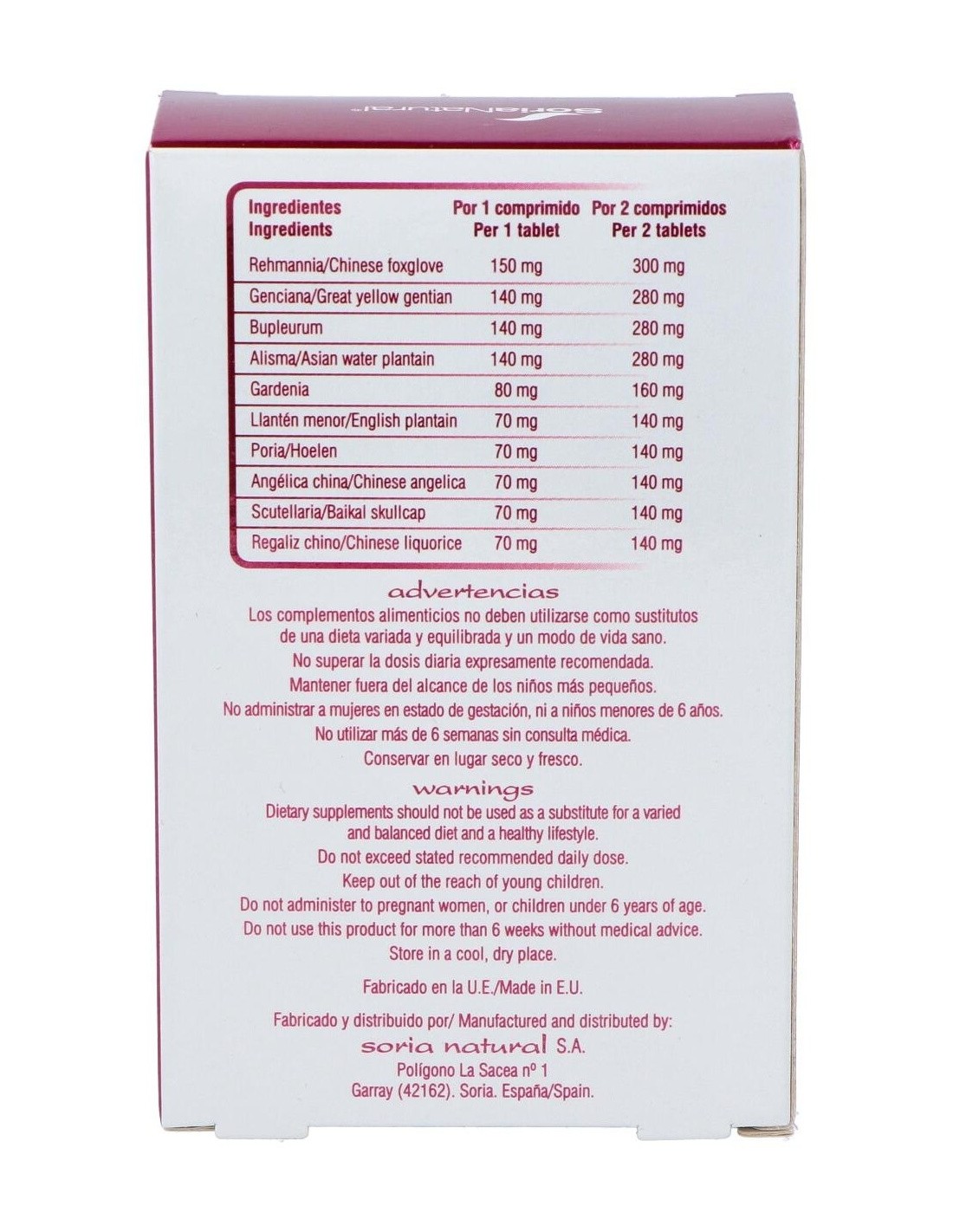 Estabilizante (Celulosa microcristalina), Extracto seco de Rehmannia (Rehmannia glutinosa (Gaertn.) Libosch.), Extracto seco de Genciana (Gentiana lutea L.), Extracto seco de Bupleurum (Bupleurum chinense DC.), Extracto seco de Alisma (Alisma orientale (Sam.) Juzep. in Kom.), Extracto seco de Gardenia (Gardenia jasminoides J. Ellis), Extracto seco de Llantén menor (Plantago lanceolata L.), Extracto seco de Poria (Poria cocos Wolf), Extracto seco de Angélica china (Angelica sinensis Diels), Extracto seco de Scutellaria (Scutellaria baicalensis Georgi), Extracto seco de Regaliz chino (Glycyrrhiza uralensis Fischer ex De Candoll), Estabilizante (Hidroxipropilcelulosa), Antiaglomerante (Dióxido de silicio), Agente de recubrimiento (Copolímero neutro), Antiaglomerante (Estearato de magnesio) y Colorantes (Beta-caroteno y Antocianos).