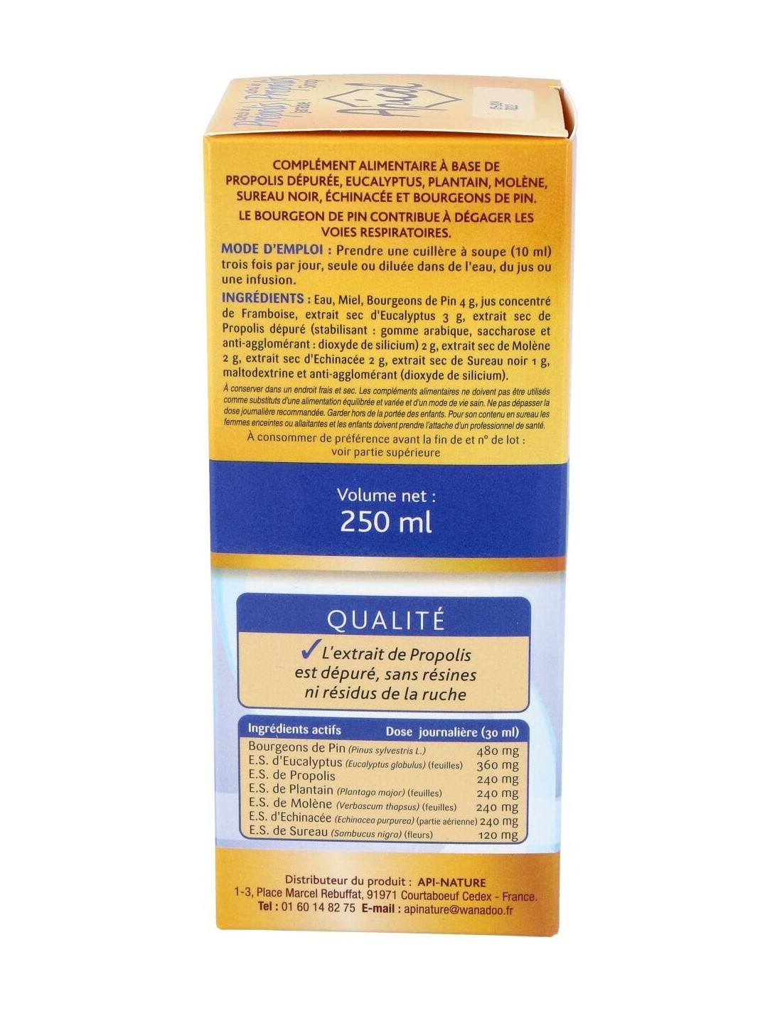 Complemento natural expectorante y balsámico elaborado con própolis depurado y extracto de planta que contribuyen a liberar las vías respiratorias. Está elaborado con Própolis depurado, Eucalipto, Llantén, Gordolobo, Sauco, Equinacea y Yemas de Pino. El Pino tiene una influencia beneficiosa sobre la garganta y las vías respiratorias obstruidas, ayuda a descongestionar la nariz y a respirar más libremente. La Echinácea y el Llantén alivian en caso de irritación de garganta y tienen un efecto suavizante y agradable sobre garganta, faringe y cuerdas vocales. La Echinácea contribuye a la correcta función de las defensas. Y contiene extracto de Própolis depurado, libre de resinas y restos no activos procedentes de la colmena.