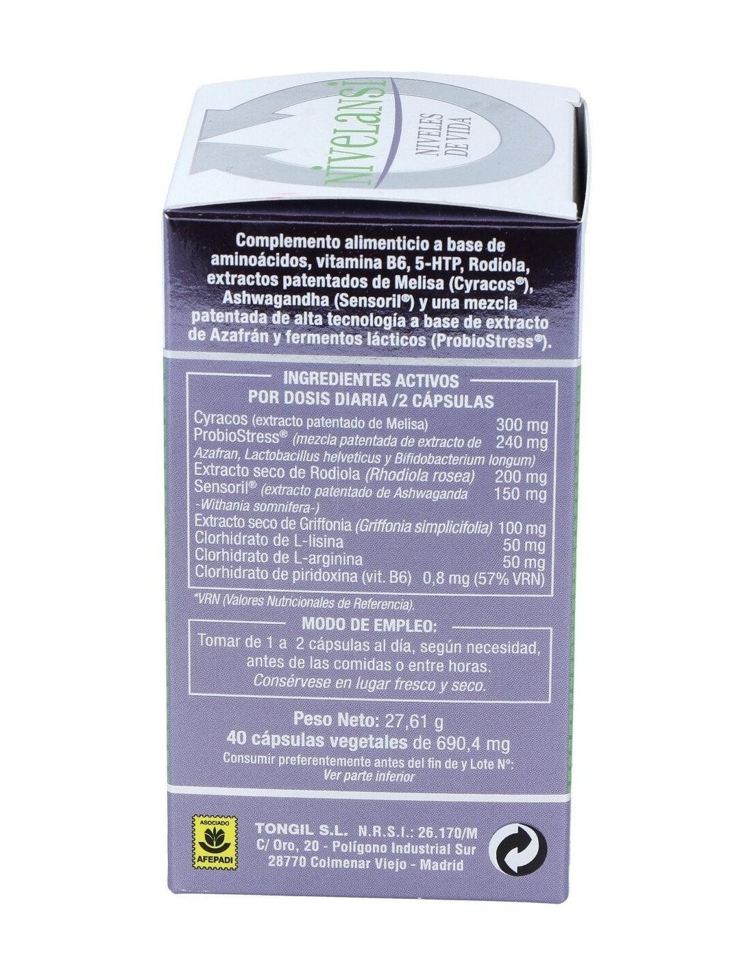 Cyracos (extracto seco de melisa- melissa officinalis L-estandarizado en ácido hidroxicinámico), ProbioStress (almidón de maíz, extracto seco de estigmas de azafrán-crocus sativus-lactobacillus helveticus y bifidobacterium longum) extracto seco de rodiola- rhodiola rosea- cápsula vegetal, Sensoril (extracto seco de ashwagandha- whitania somnifera- maltodextrina y antiaglomerante: dióxido de silicio), extracto seco de griffonia estandarizado en 5-HTTP, antiaglomerante (dióxido de silicio), clorhidrato de L-arginina, clorhidrato de L-lisina y clorhidrato de piridoxina.