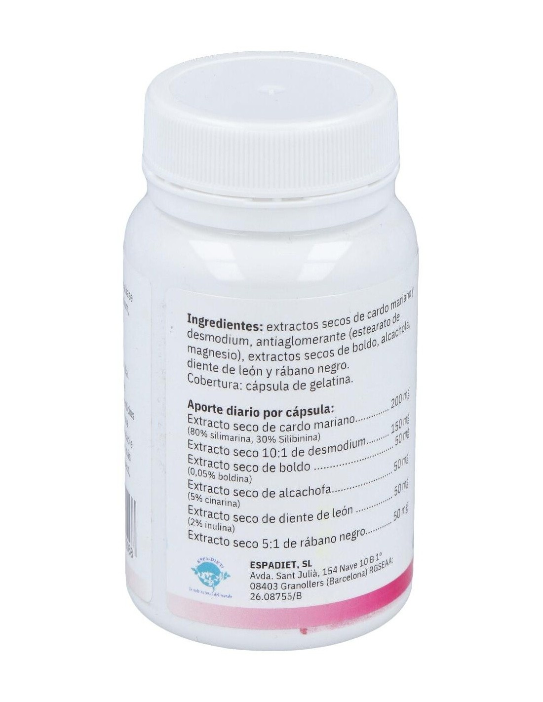 Extractos secos de cardo mariano y desmodium, antiaglomerante (estearato de magnesio), extractos secos de boldo, alcachofa, diente de león y rábano negro. Cobertura: cápsula de gelatina.