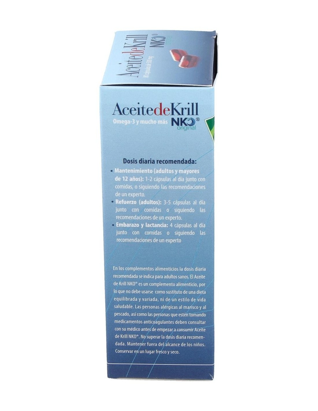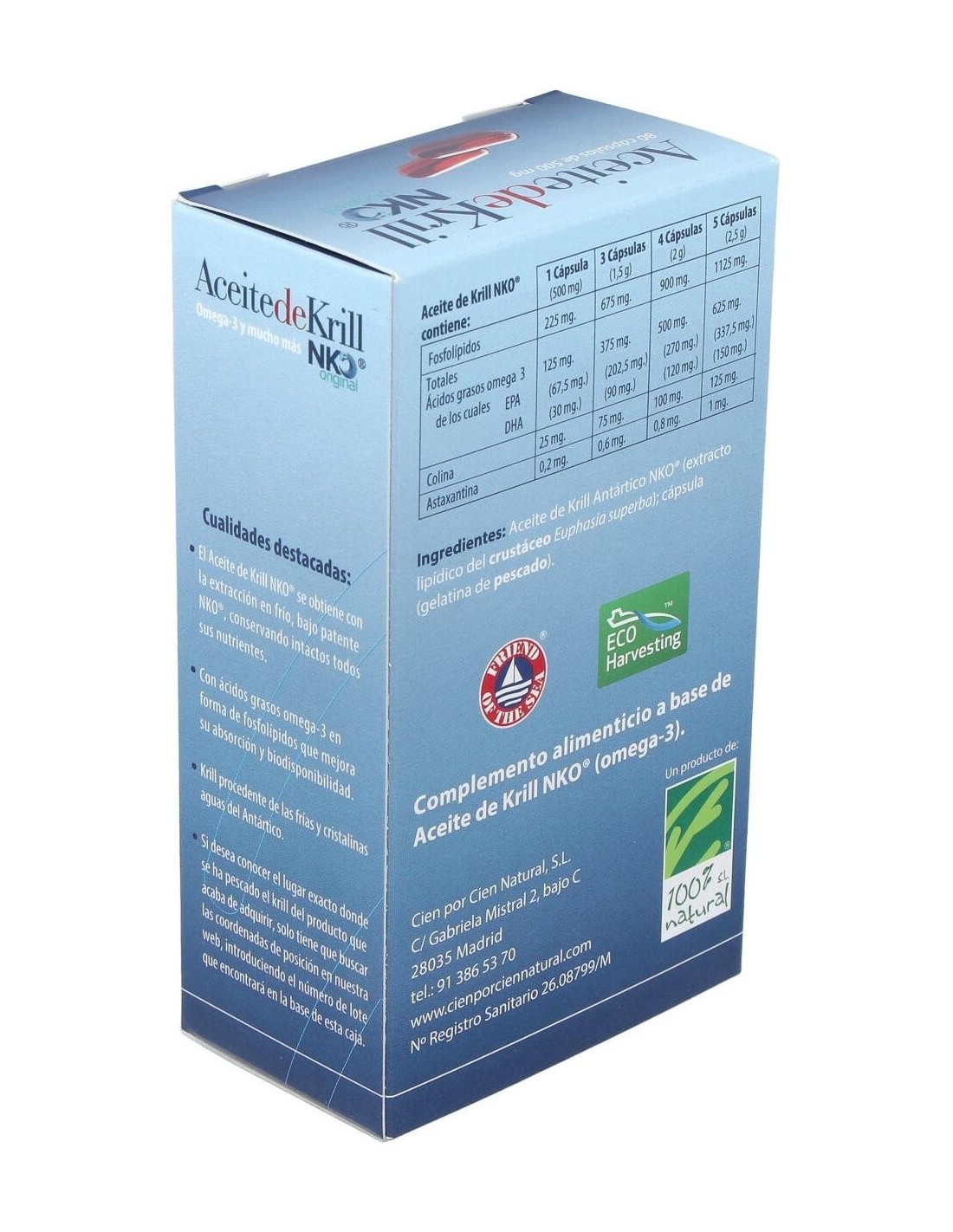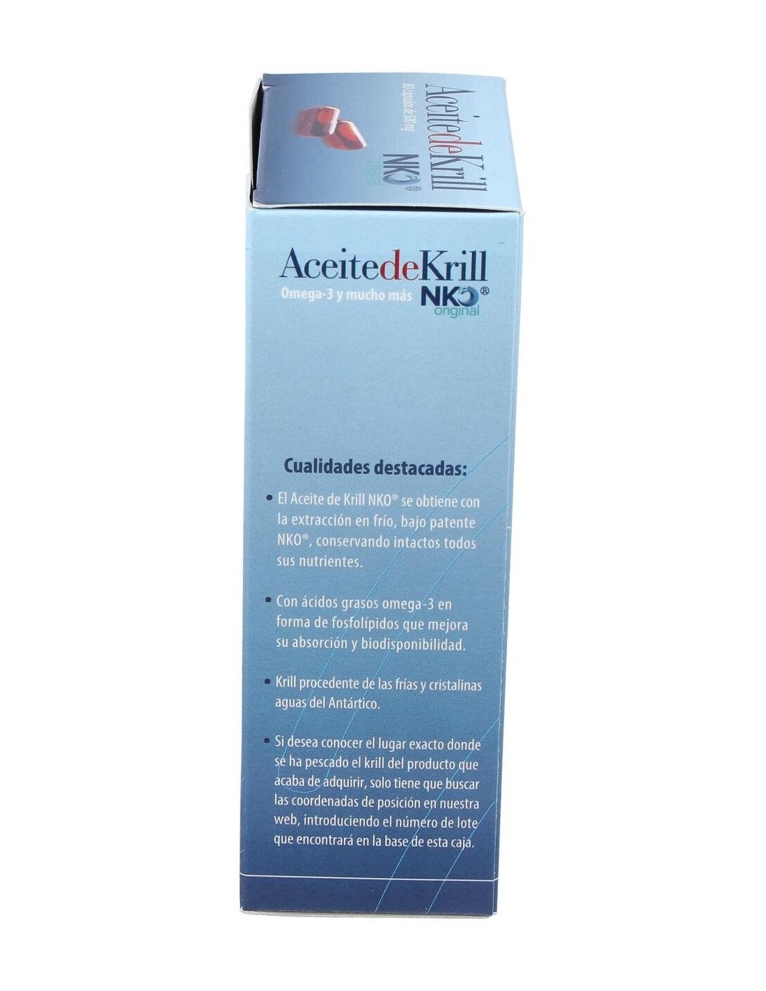 Aceite de kril antártico NKO (extracto lipídico del crustáceo), cápsula: gelatina de pescado.