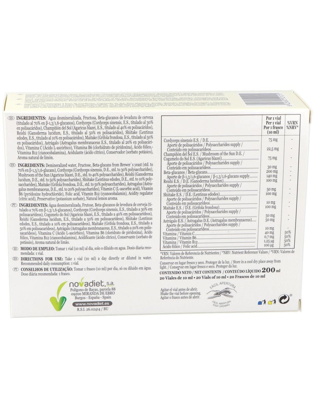 Agua desmineralizada, Fructosa, Beta-glucano de levadura de cerveza (Titulado al 70% en 1,3/1,6 glucanos) , Reishi ganoderma lucidum(e.s. titulado al 50% en polisacáridos), Shiitake (e.s. titulado al 10% en polisacáridos), Maitake (e.s. titulado al 50% en polisacáridos), cordyceps (e.s titulado al 30% en polisacáridos), champiñón del sol (e.s. titulado al 40% en polisacáridos), aroma natural de limón, Astrágalo (e.s. titulado al 20% en polisacáridos), Vitamina C (Ácido L-ascórbico), Acidulante (ácido cítrico), Conservadores (sorbato potásico, benzoato sódico), vitamina B6 (clorhidrato de piridoxina), ácido fólico, vitamina B12 (cianocobalamina)