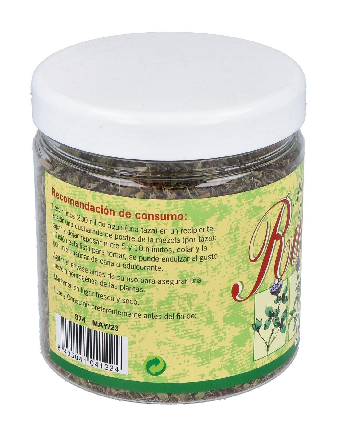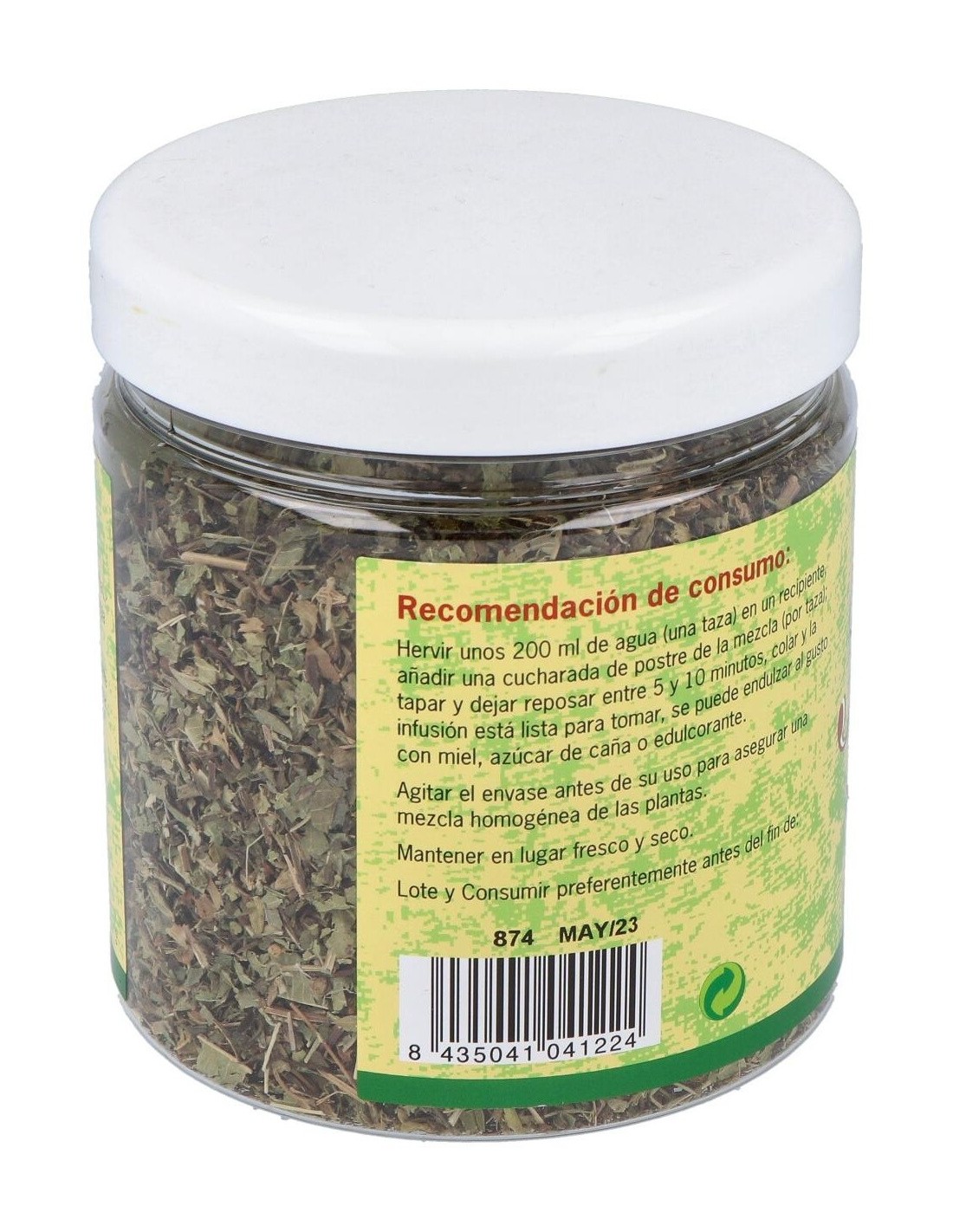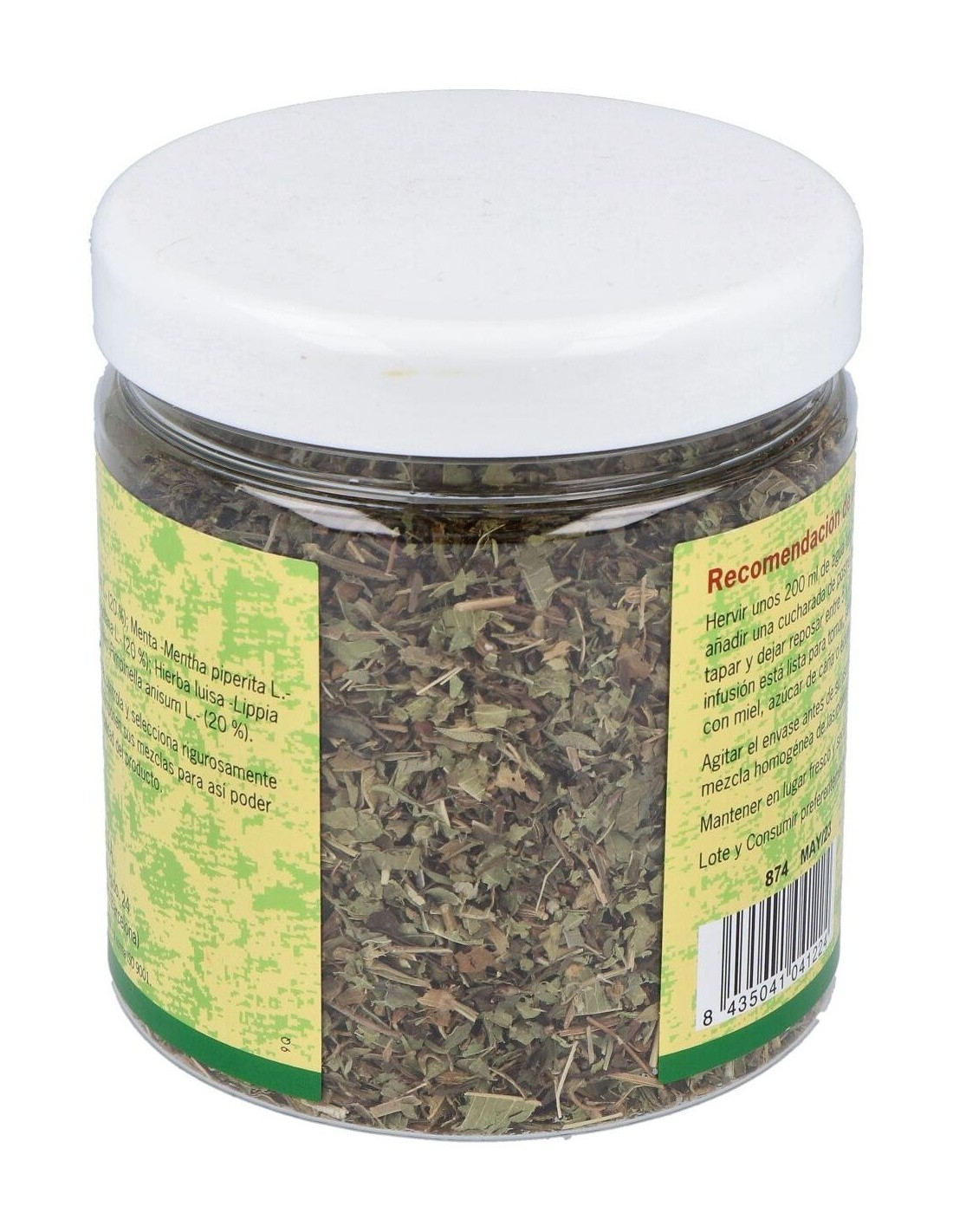 Albahaca (Ocimum basilicum) 20%, Menta (Mentha piperita) 20%, Ajedrea (Satureja montana) 20%, Hierba luisa (Lippia citriodora) 20%, Anís (Pimpinella anisum) 20%.