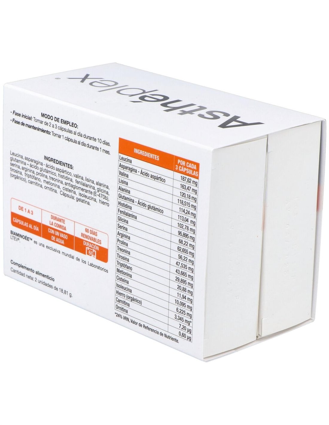 Leucina, asparagina - ácido aspártico, valina, lisina, alanina, glutamina - ácido glutámico, histidina, fenilalanina, glicina, serina, arginina, prolina, treonina, antiaglomerante (E-470b), tirosina, triptófano, metionina, cisteína, isoleucina, hierro (orgánico), carnitina, ornitina. Cápsula: gelatina, colorante (E-171).