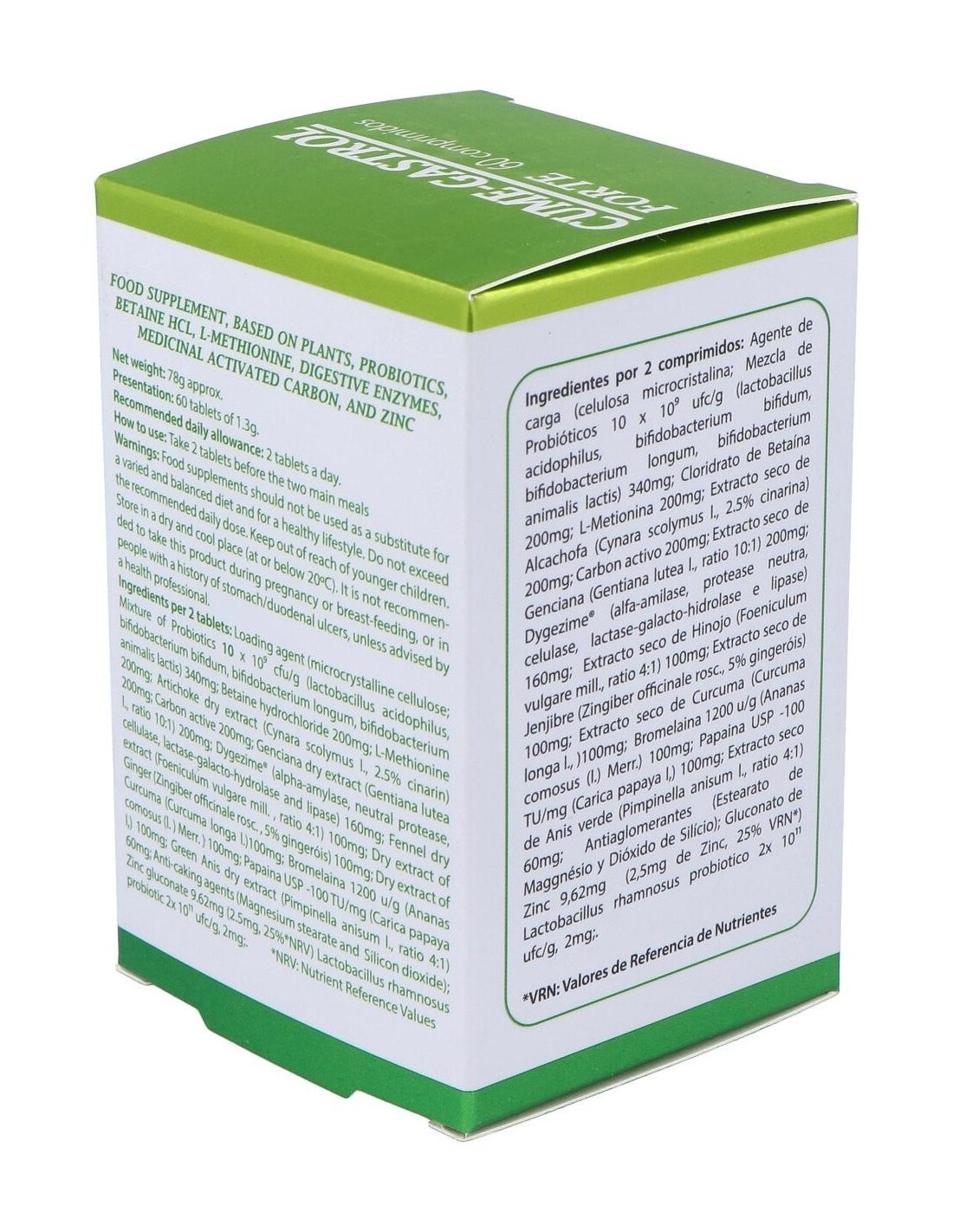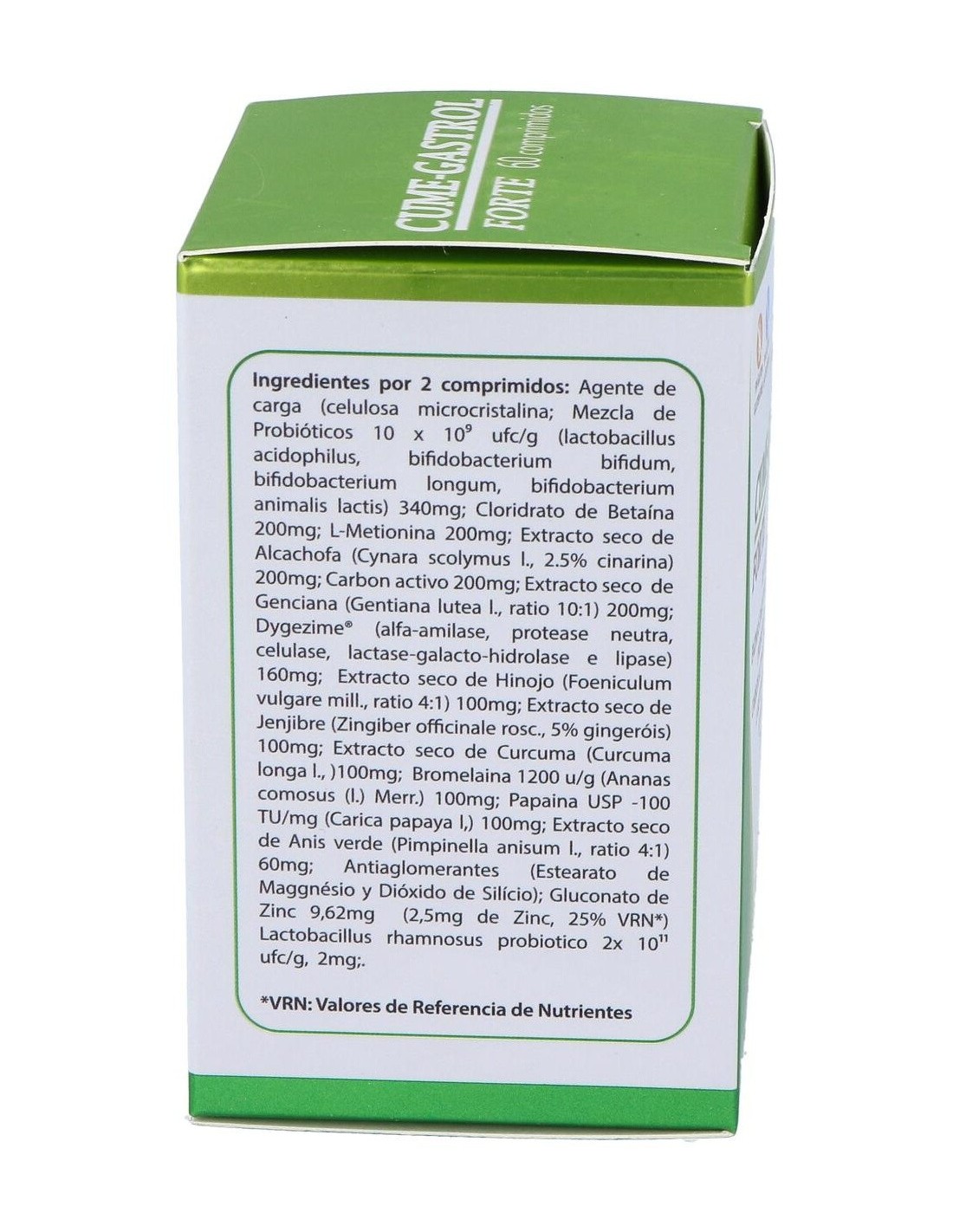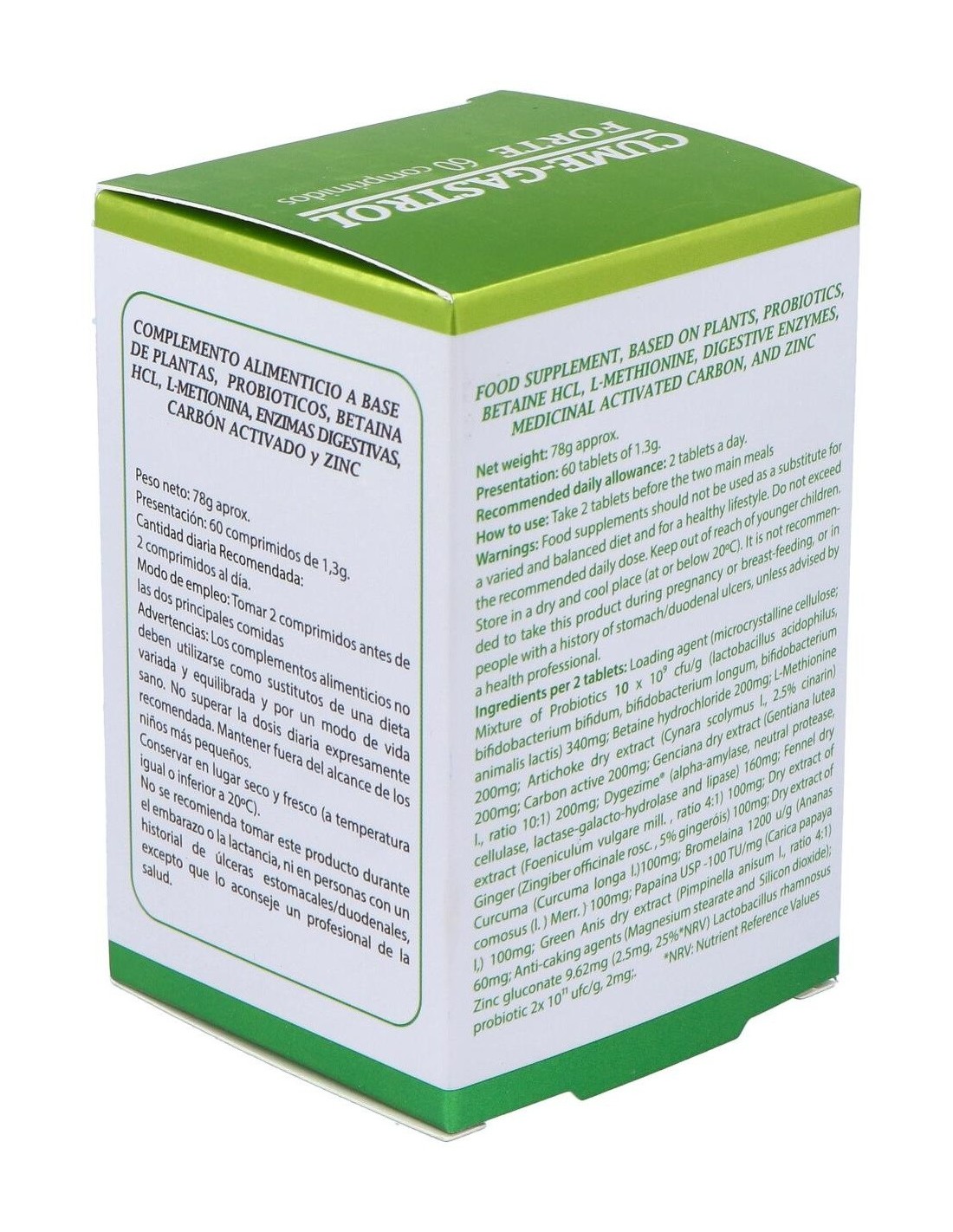 Betaína 200 mg, L-metionina 200 mg, alcachofera (cynara scolimus hojas) 200 mg, carbón activado medicinal 200 mg, probiótico uas blend 1x10 (9) (L-acidophillus, B longum, B bifidum y B lactis) 340 mg, zinc sulfato (36,4% ión zn) 100 mg, hinojo (foeniculum vulgaris) 100 mg, jengibre (zingiber officinalis) 100 mg, genciana (genthiana lutea) 100 mg, bromelaina (1200 U/G) 100 mg, papaina (6000 USP-100 TU) 100 mg, Digezyme (alfa amilasa, proteasa neutra, celulasa, lactasa galactohidrolosa y lipasa) 100 mg, anís verde (pimpinella anisum) 60 mg, lactobacillus rhamnosus (2x1011) 4 mg.