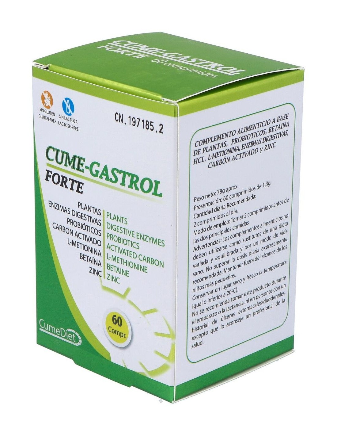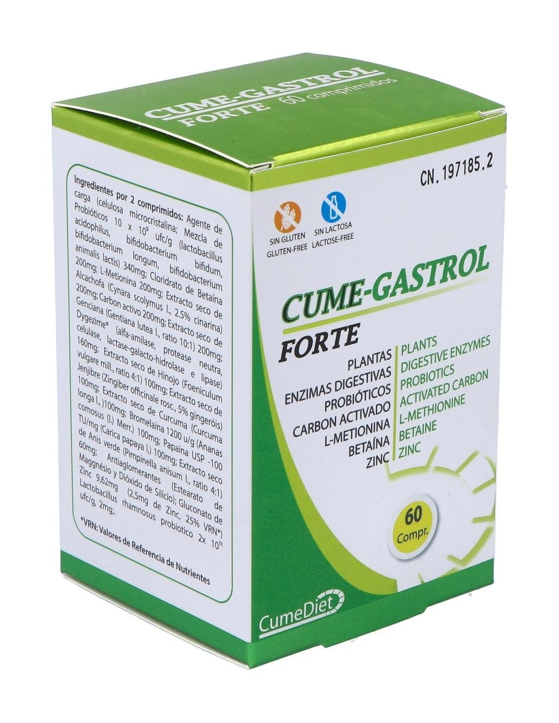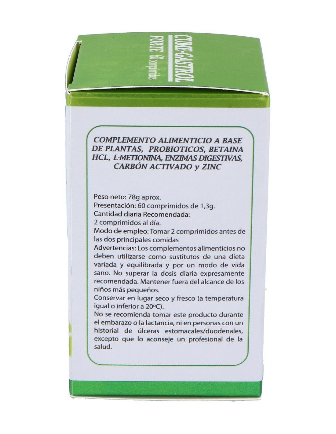 Betaína 200 mg, L-metionina 200 mg, alcachofera (cynara scolimus hojas) 200 mg, carbón activado medicinal 200 mg, probiótico uas blend 1x10 (9) (L-acidophillus, B longum, B bifidum y B lactis) 340 mg, zinc sulfato (36,4% ión zn) 100 mg, hinojo (foeniculum vulgaris) 100 mg, jengibre (zingiber officinalis) 100 mg, genciana (genthiana lutea) 100 mg, bromelaina (1200 U/G) 100 mg, papaina (6000 USP-100 TU) 100 mg, Digezyme (alfa amilasa, proteasa neutra, celulasa, lactasa galactohidrolosa y lipasa) 100 mg, anís verde (pimpinella anisum) 60 mg, lactobacillus rhamnosus (2x1011) 4 mg.