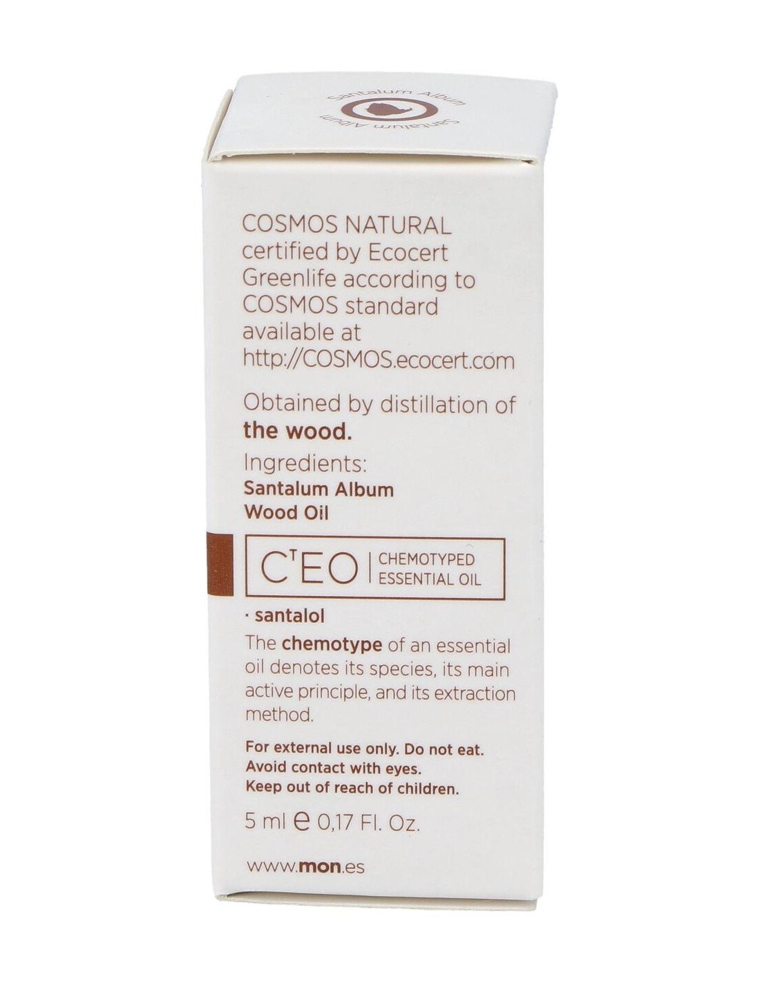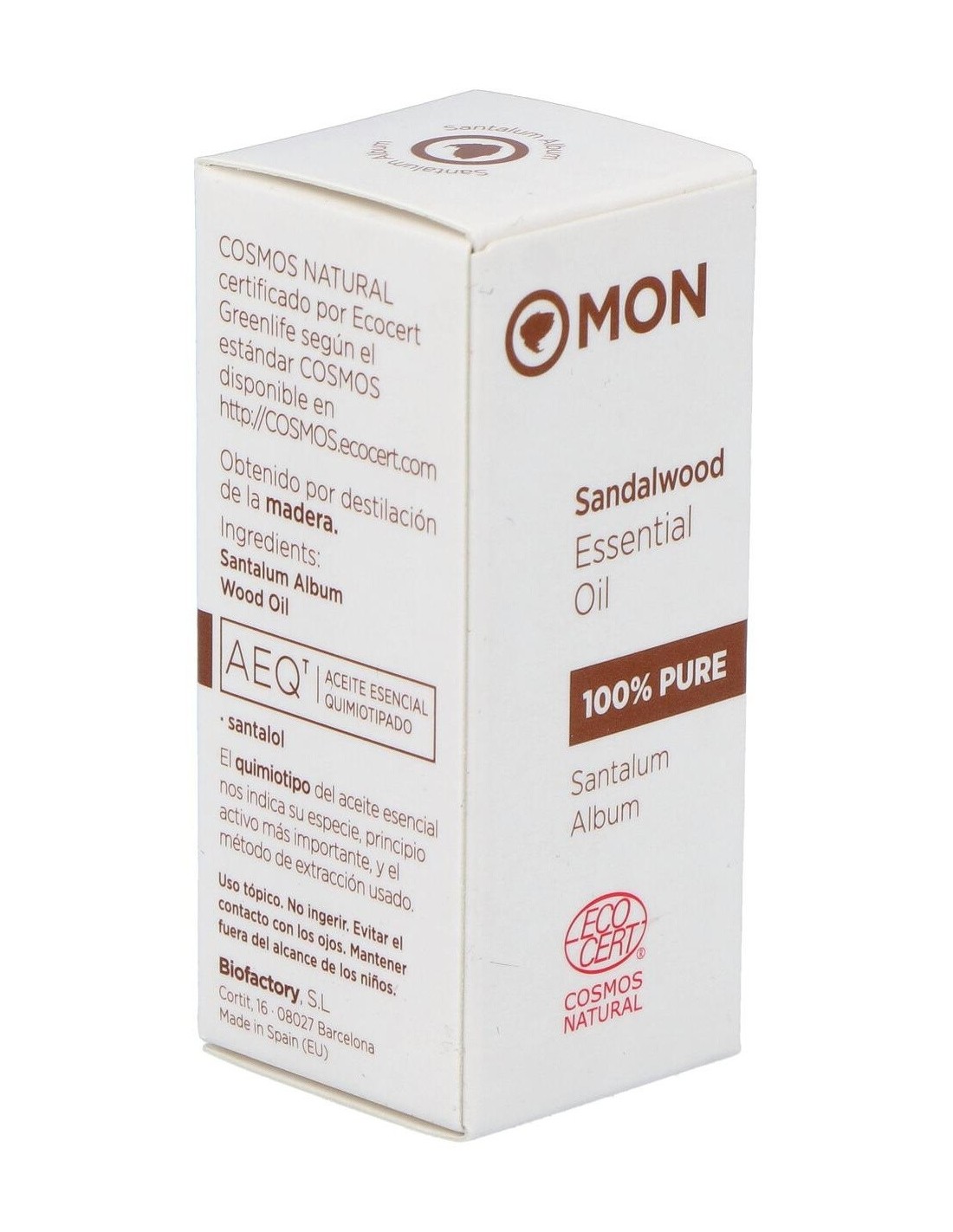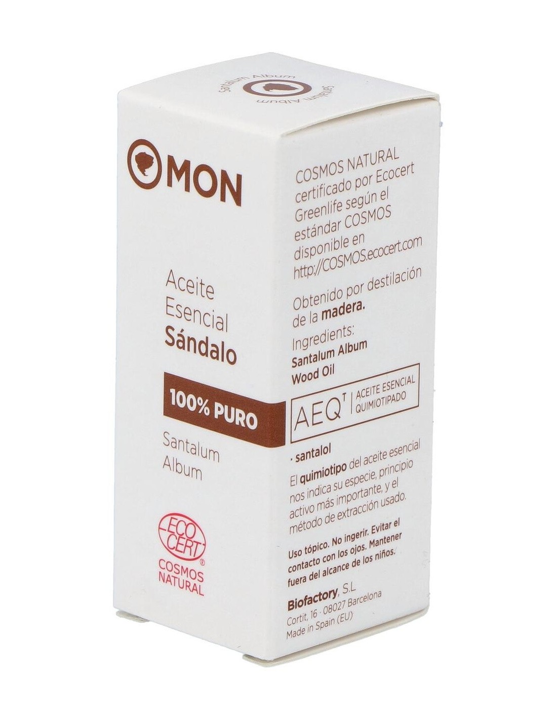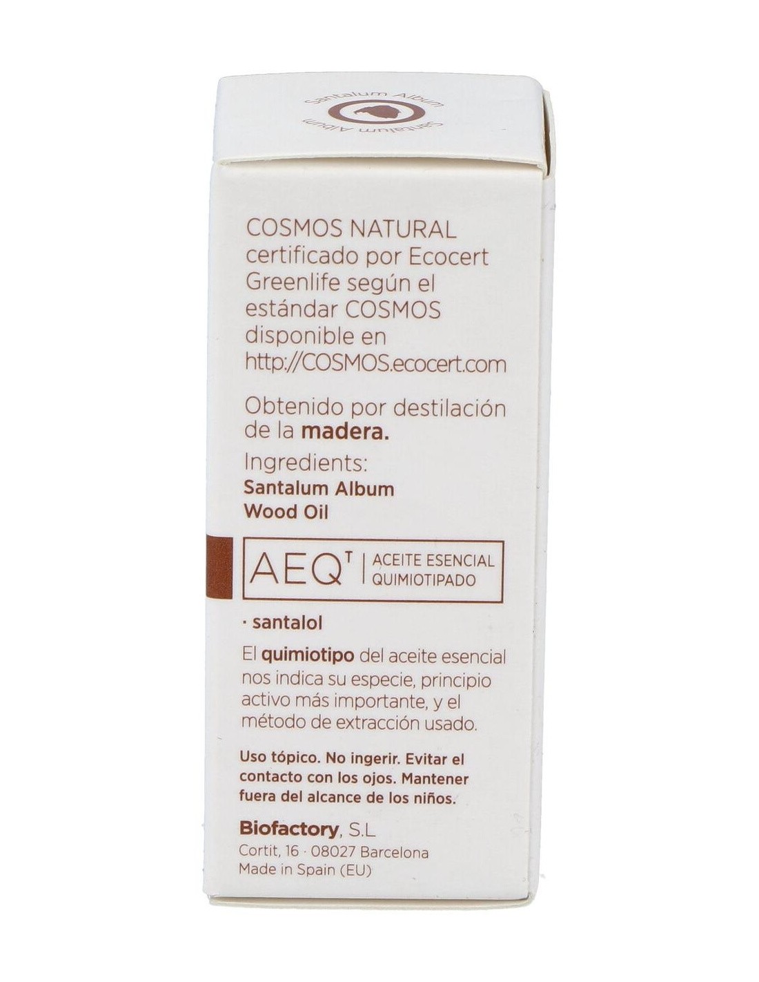 Aceite esencial 100% puro de Santalum Album, obtenido por destilación al vapor de la madera. Con santalol como principio activo.