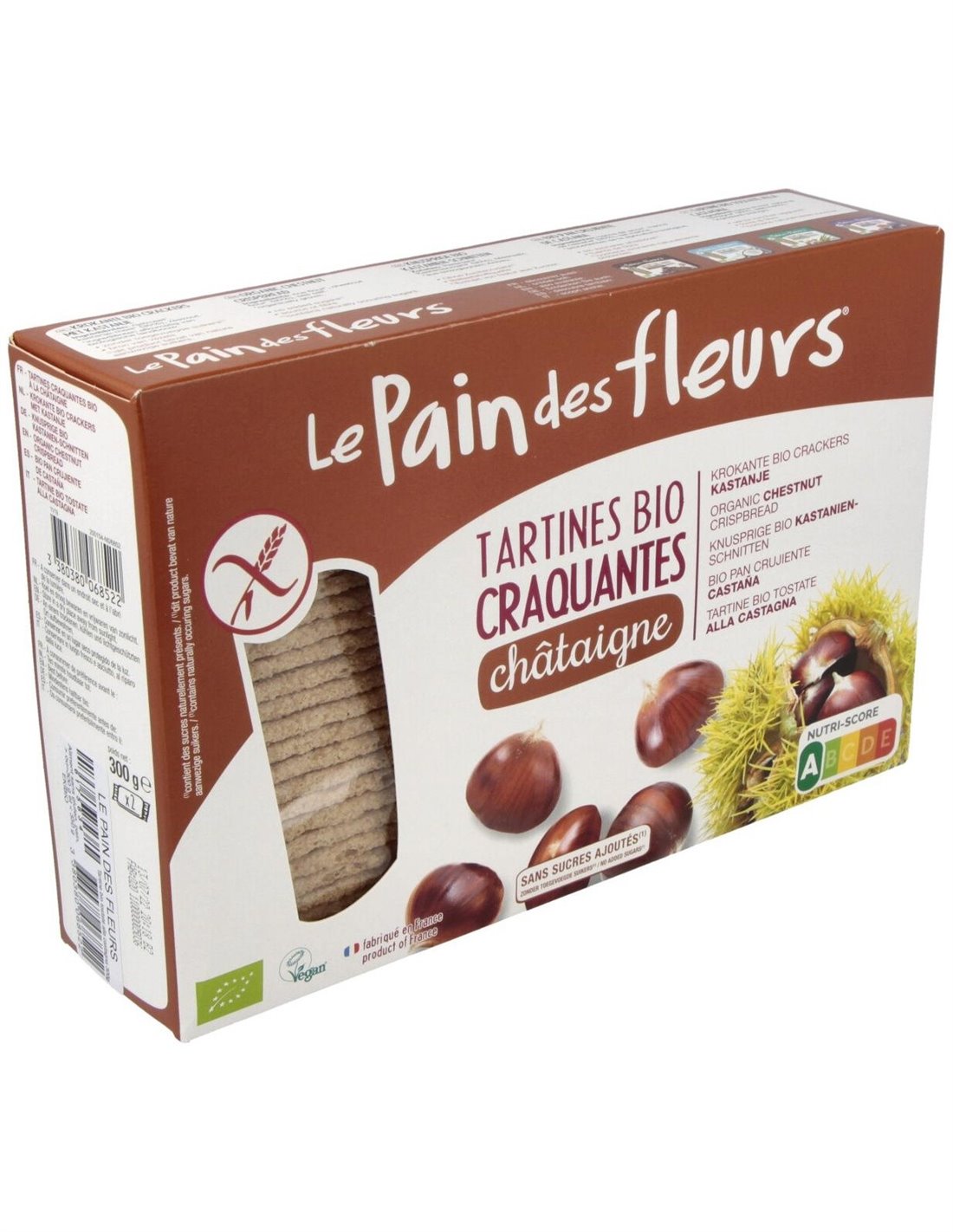 Cracker crujiente con castaña. Fuente de fibra. Sin azúcares añadidos. Contiene azúcares naturalmente presentes. Producto sin gluten. Vegano.