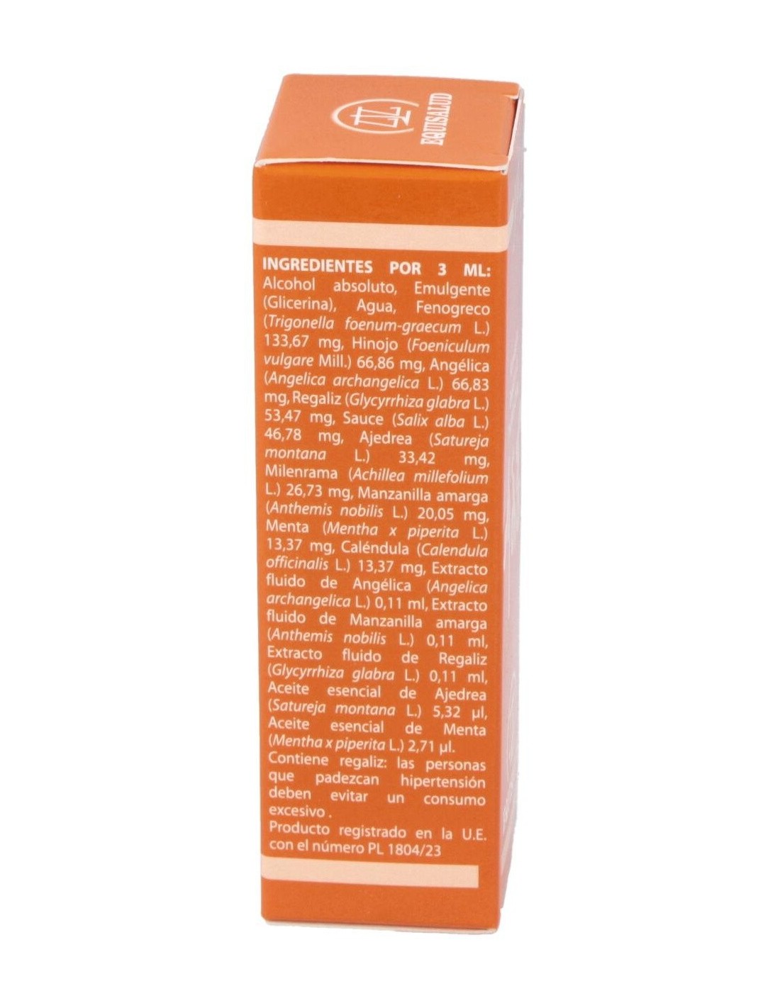 AGUA PURIFICADA, AJEDREA, ALCOHOL ABSOLUTO, ANGÉLICA, CALÉNDULA, FENOGRECO, GLICERINA, HINOJO, MANZANILLA AMARGA, MENTA, MILENRAMA, REGALIZ, SAUCE.