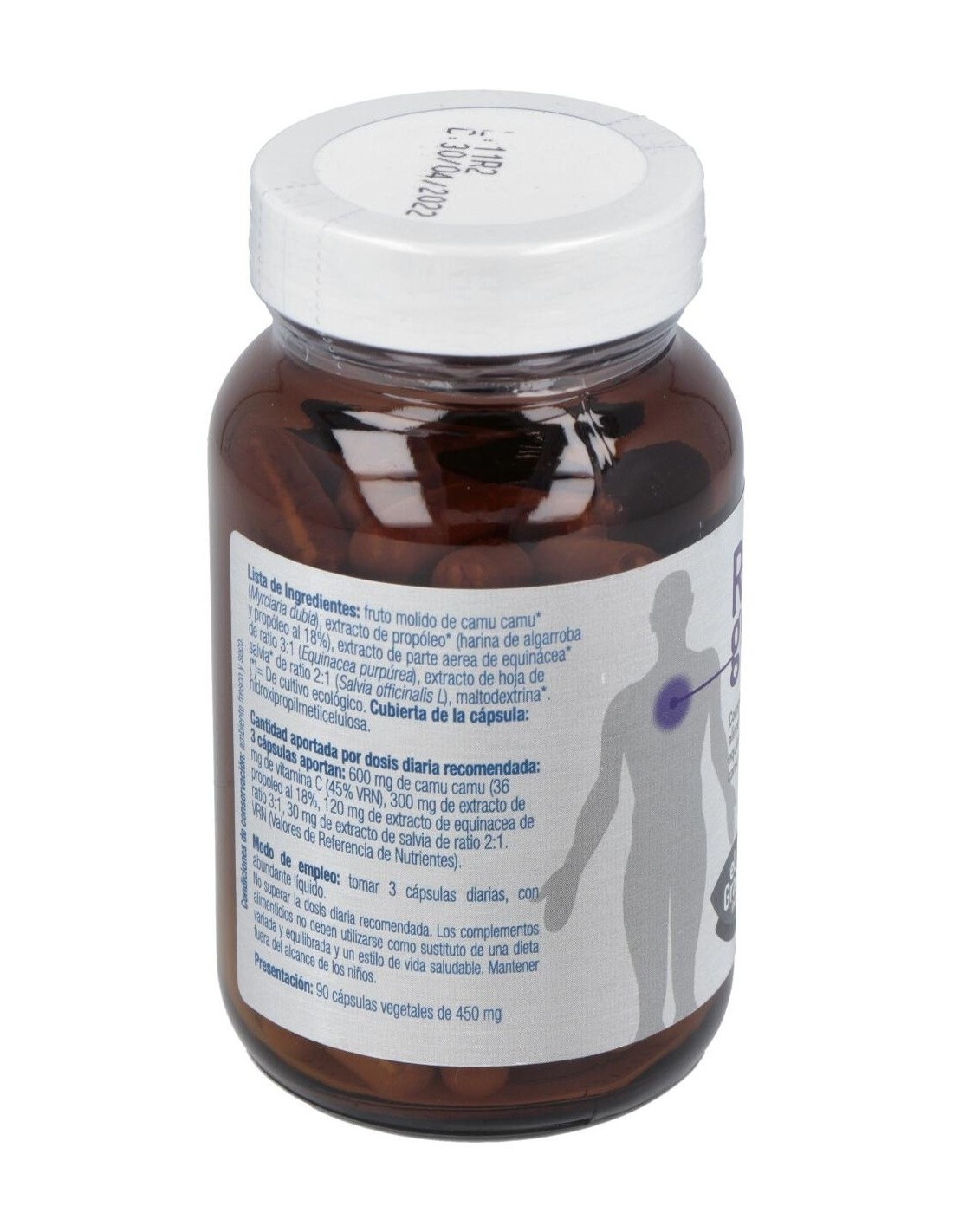 Fruto molido de camu camu* (Myrciaria dubia), extracto de propóleo* (harina de algarroba y propóleo al 18%), extracto de parte aérea de equinácea* de ratio 3:1 (Equinacea purpurea), extracto de hoja de salvia* de ratio 2:1 (Salvia officinalis L), maltodextrina*, (*) De cultivo ecológico. Cubierta de la cápsula: hdroxipropilmetilcelulosa. Cantidad aportada por dosis diaria recomendada: 3 cápsulas aportan: 600 mg de camu camu (36 mg de vitamina C (45% VRN), 300 mg de extracto de propóleo al 18%, 120 mg de extracto de equinácea de ratio 3:1, 30 mg de extracto de salvia de ratio 2:1, VRN (Valores de Referencia de Nutrientes).