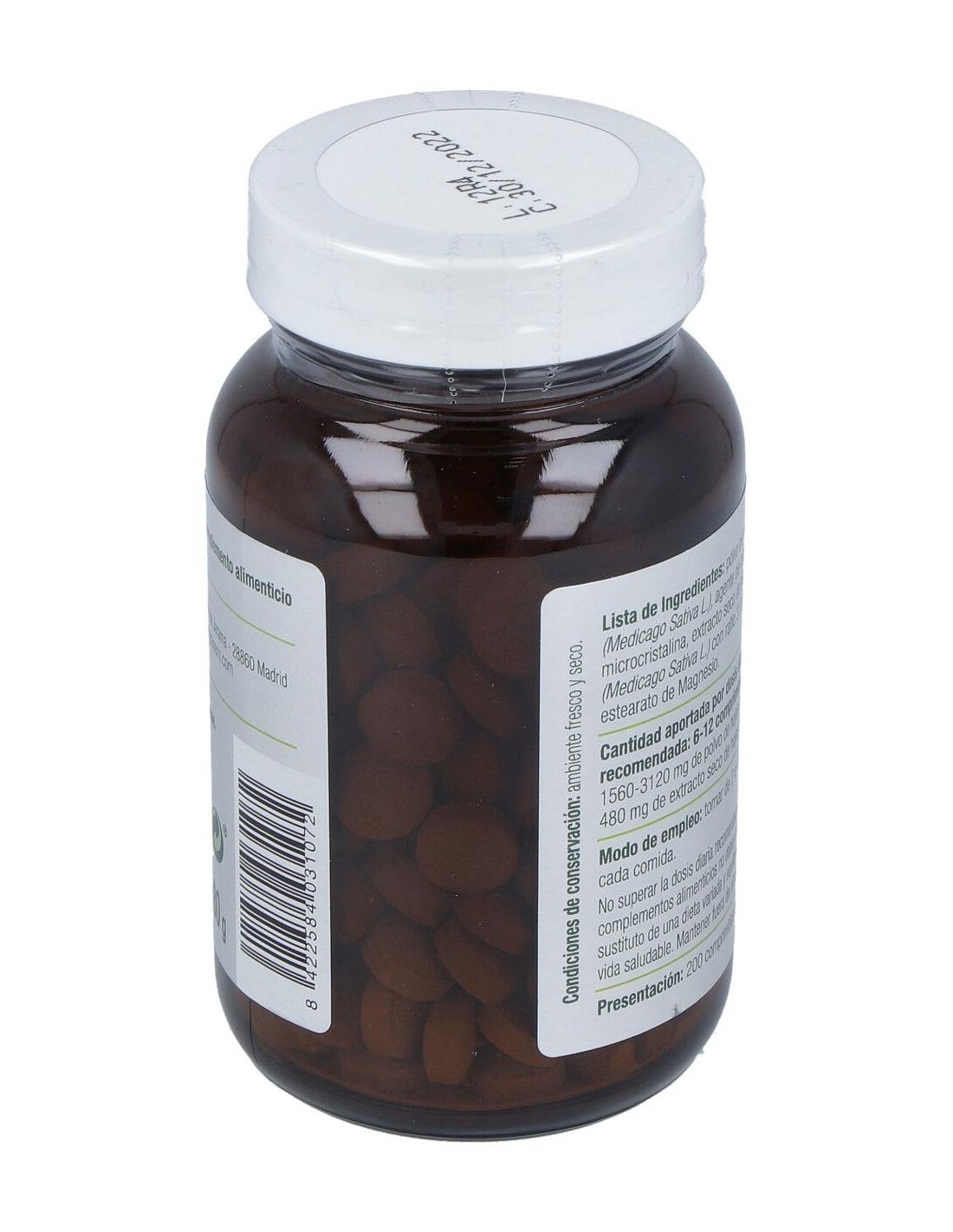Polvo de hojas de alfalfa (Medicago Sativa L.), agente de carga: celulosa microcristalina, extracto seco de hojas de alfalfa (Medicago Sativa L.) con ratio 3:1 y antiaglomerante: estearato de Magnesio y dióxido de Silicio.