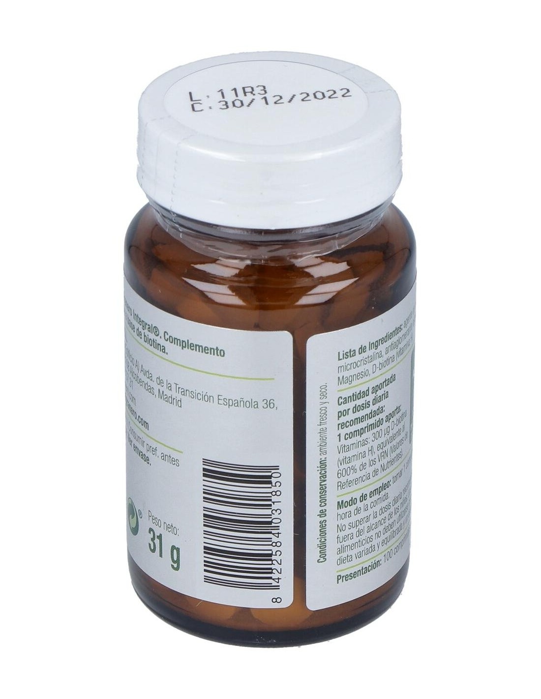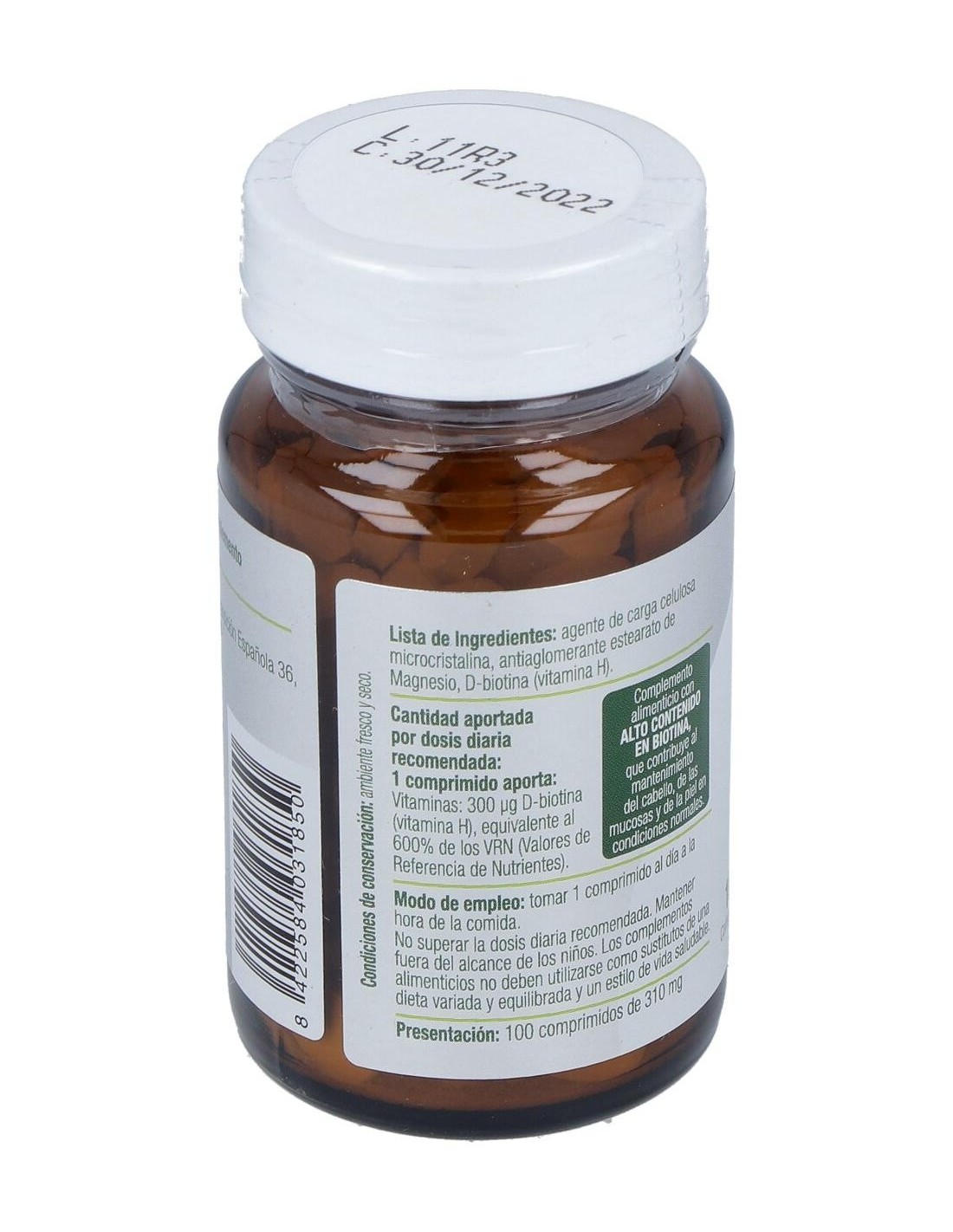 Por 1 comprimido: Biotina (300 µg), Vitamina B8 / biotina / vitamina H / coenzima R, Celulosa Vegetal, Ácido Esteárico.