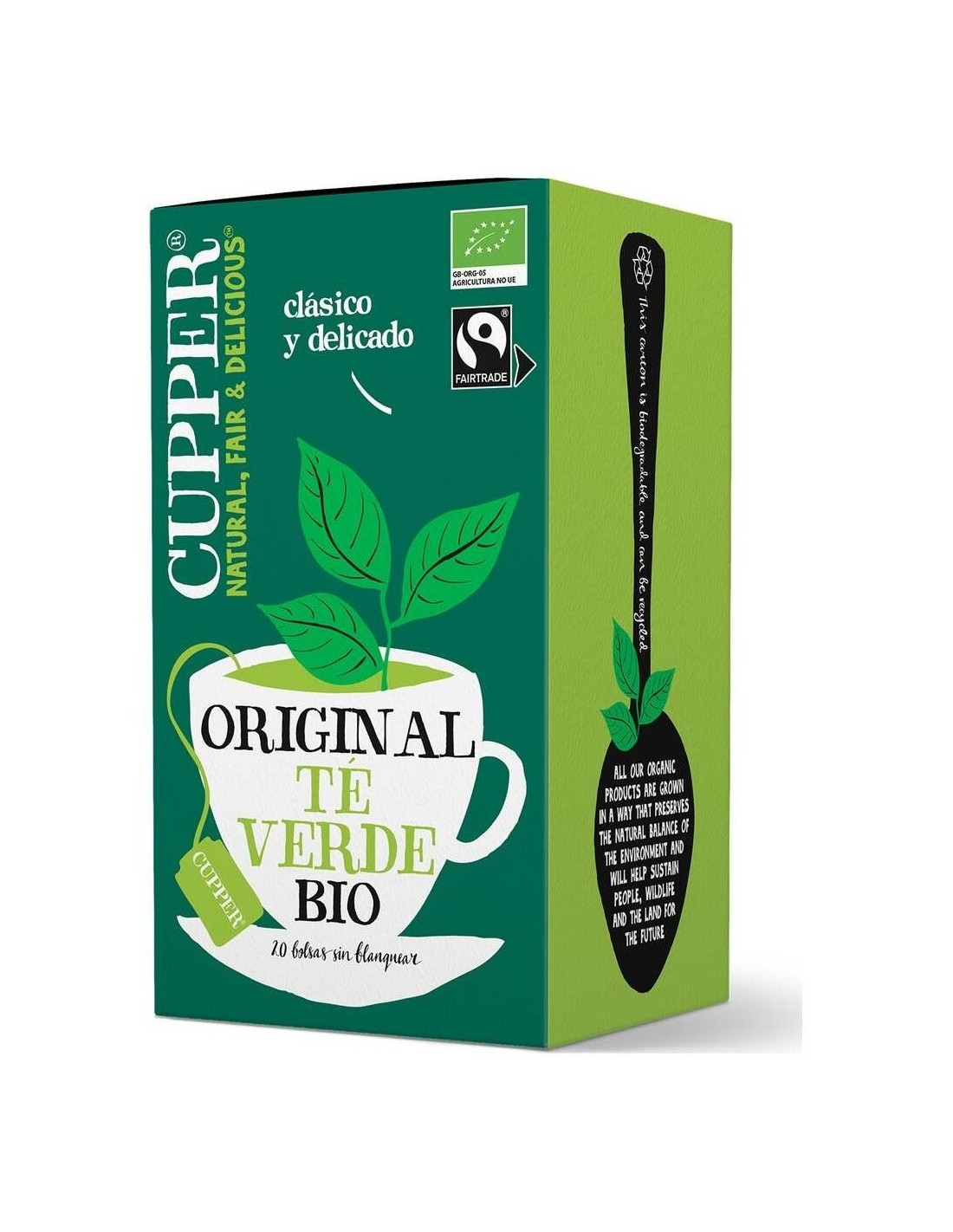 Infusión ecológica de Cupper, elaborada con té verde puro ligero y delicado, con un color dorado brillante. Cupper utiliza proveedores y productos de la más alta calidad, no hay agregado ningún elemento artificial. Producto con certificado ecológico. En formato de sobres de 20 unidades por caja.