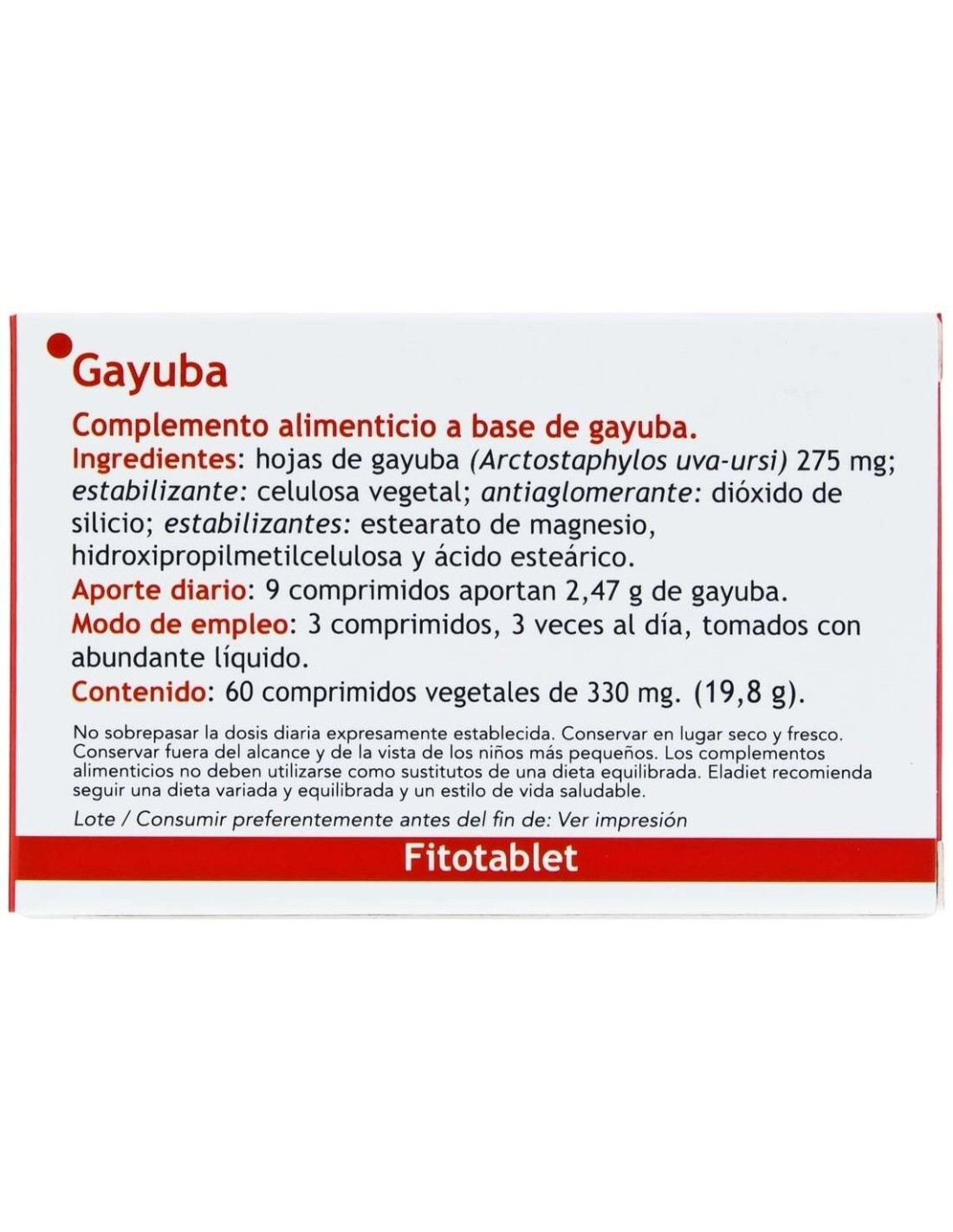 Fitotablet gayuba es un complemento alimenticio que favorece el correcto funcionamiento de las vías urinarias. Su principal ingrediente, la gayuba, posee múltiples propiedades terapéuticas como la desfinfectante y la diurética. Debido a sus beneficos suelen emplearse en infecciones urinarias como la cistitis.