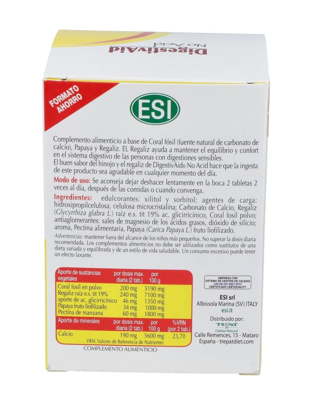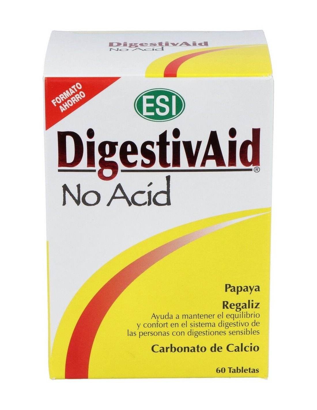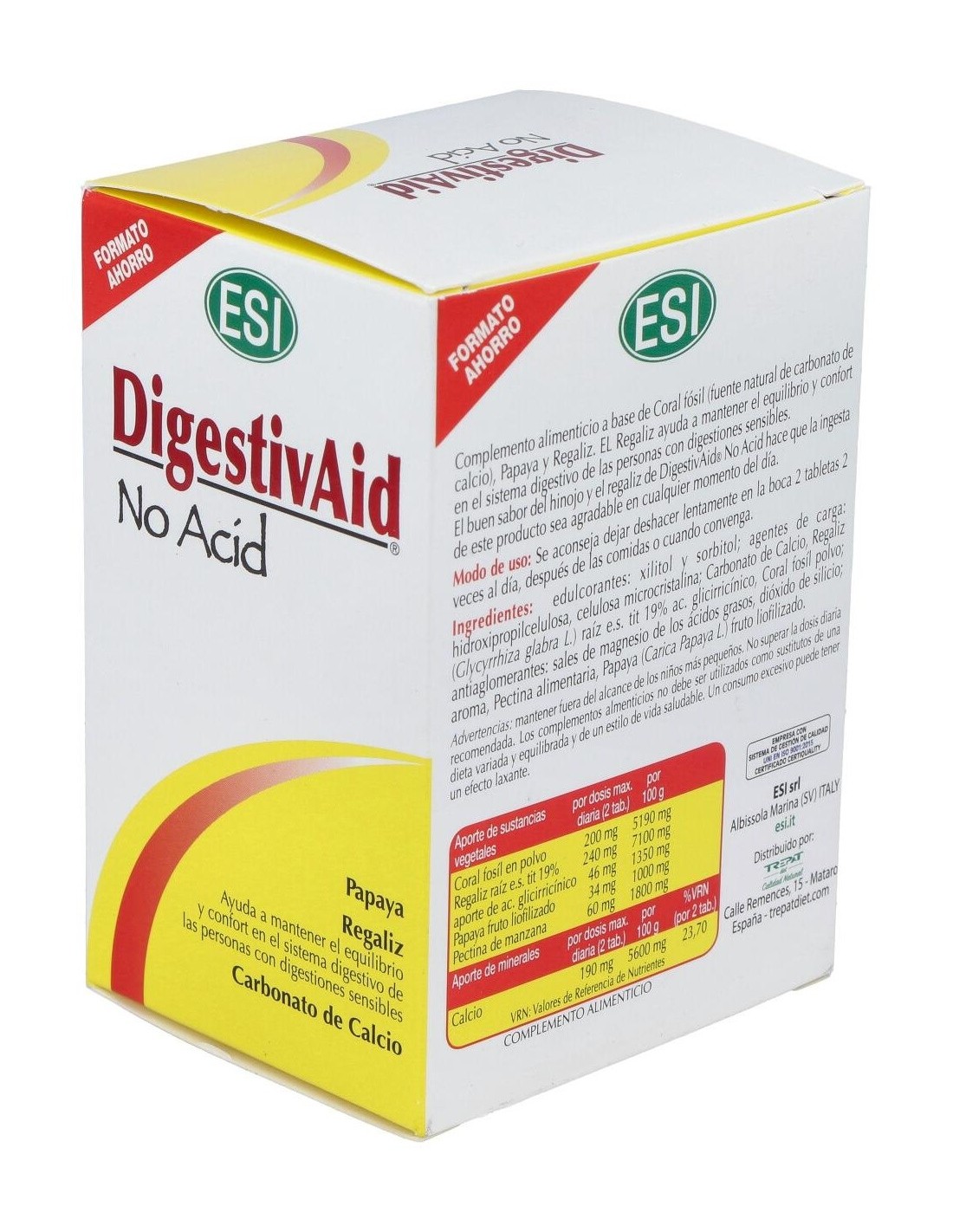 Las tabletas Digestivaid No Acid de ESI son un complemento alimenticio a base de papaya, coral fósil y regaliz que ayuda a combatir los desórdenes gástricos (gases), acidez en el estómago o digestiones pesadas. Indicado para personas con desequilibrios en las funciones metabólicas y digestivas.