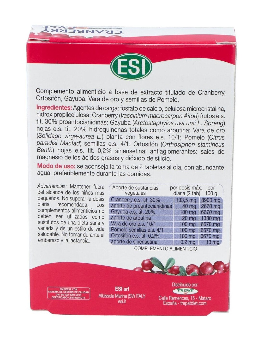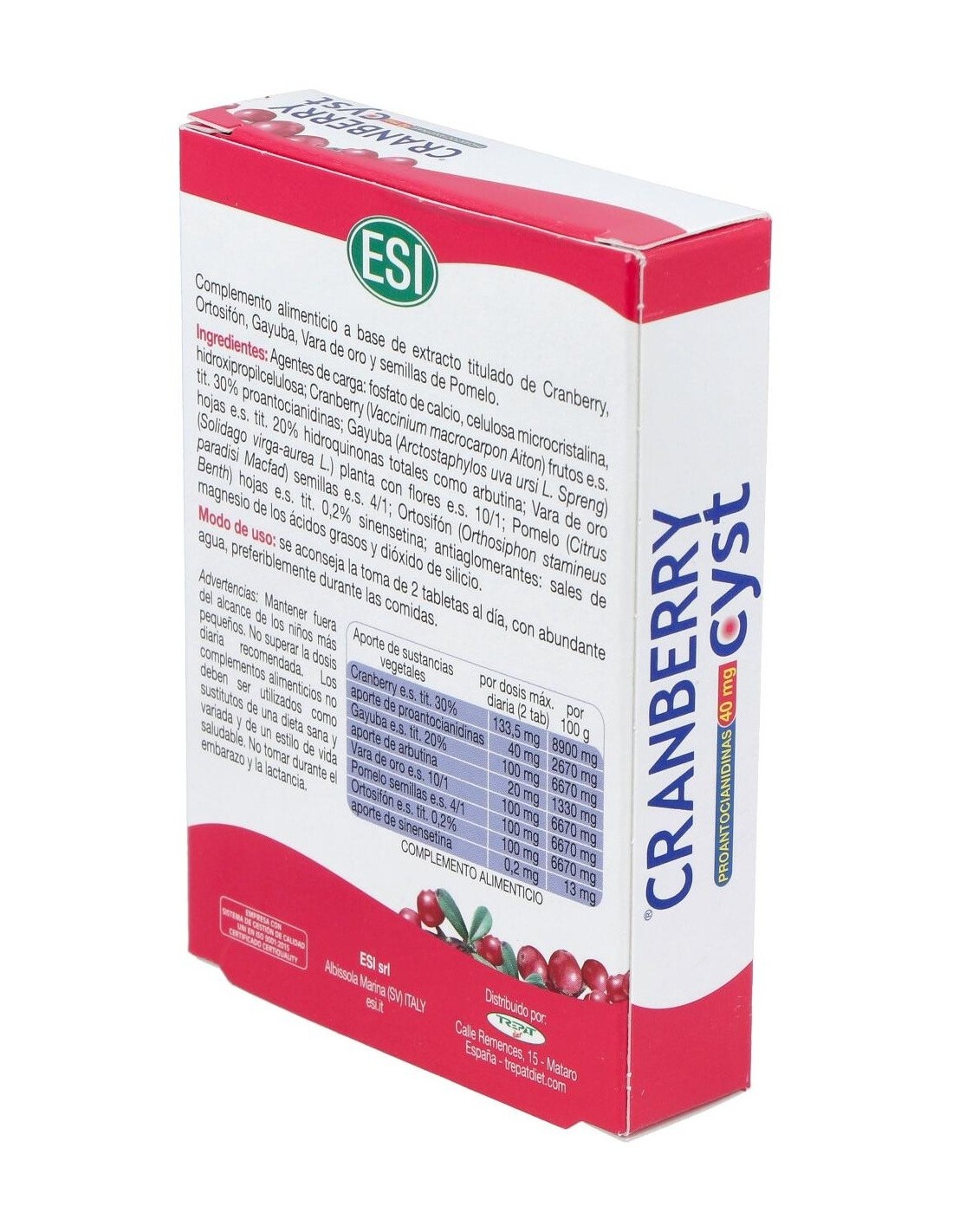 Las tabletas Cranberry Cyst (arándano rojo) de ESI es un producto diurético muy útil para personas con problemas de cistitis (tanto en fase aguda como en fase preliminar). Es decir, este complemento alimenticio está pensado para prevenir las infecciones urinarias.