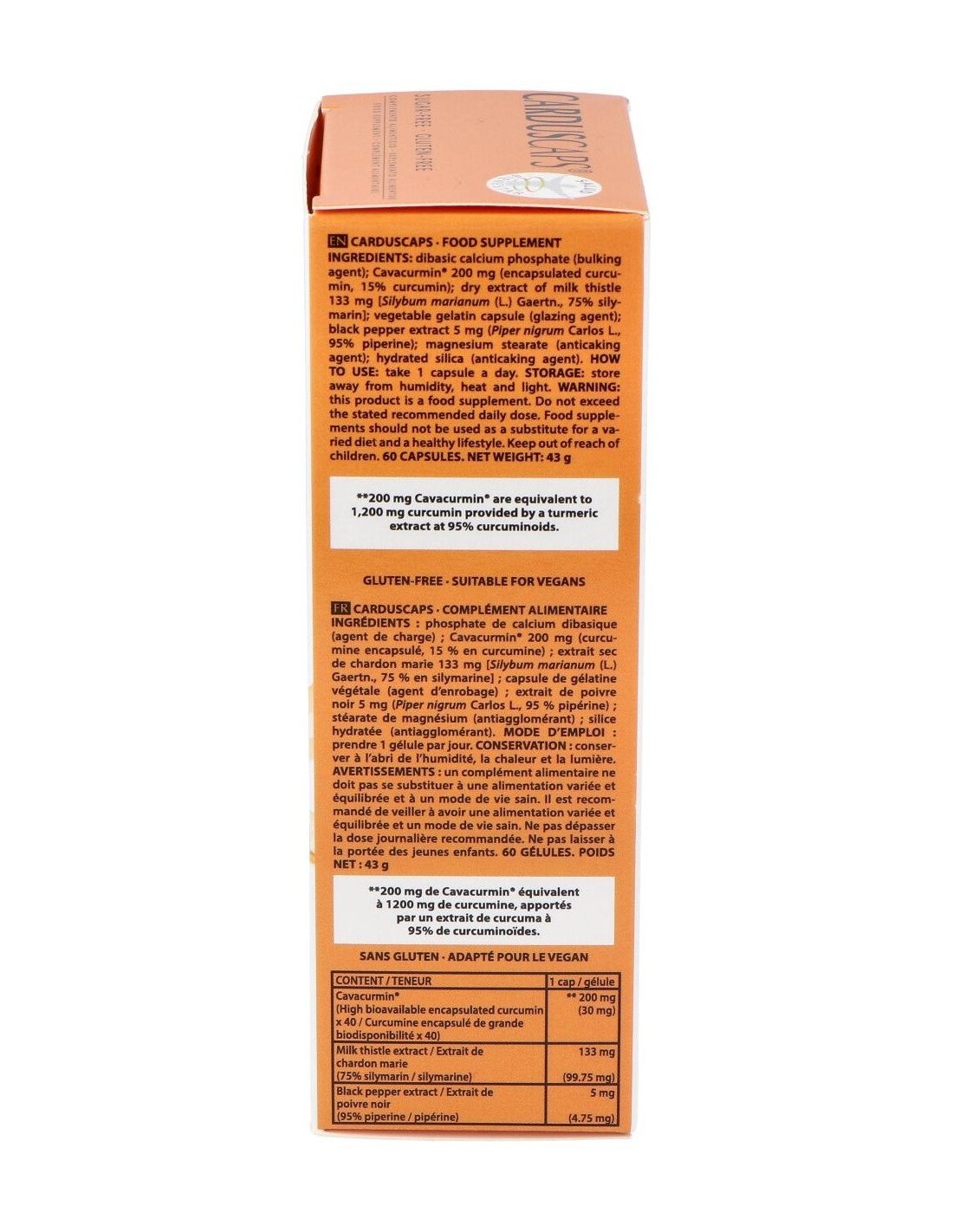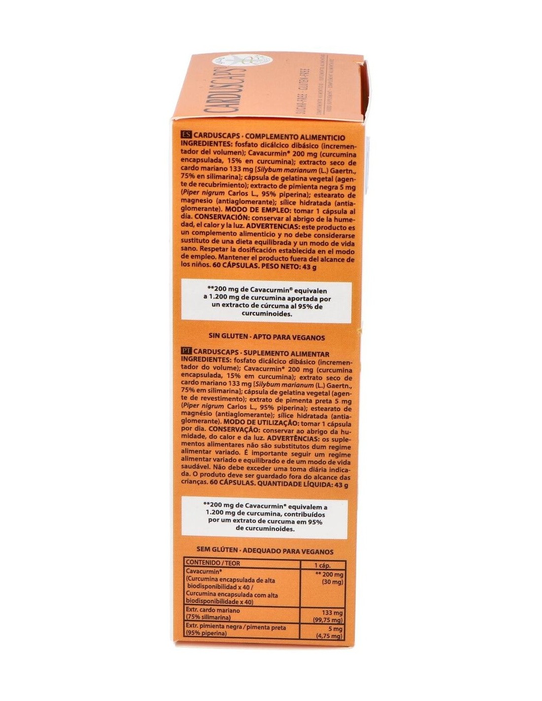 Fosfato dicálcico dibásico (incrementador de volumen): Cavacurmin® - 200 mg (curcumina encapsulada, 15% en curcumina): extracto seco de cardo mariano - 133 mg [Silybum marianum (L.) Gaertn.], 75% en silimarina: cápsula de gelatina vegetal (agente de recubrimiento): extracto de pimienta negra - 5 mg (Piper nigrum Carlos L.), 95% piperina: estearato de magnesio (antiaglomerante): sílice hidratada (antiaglomerante).