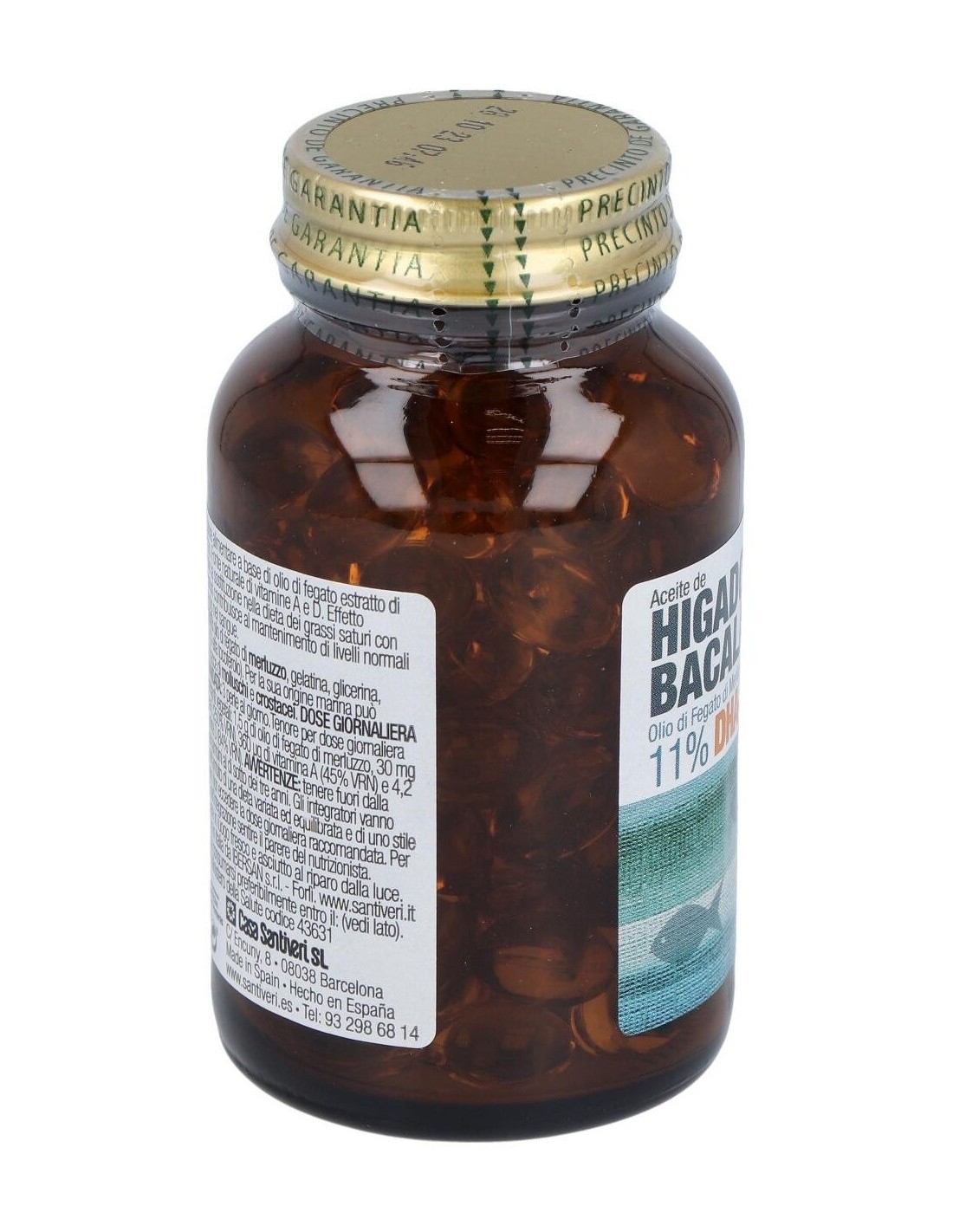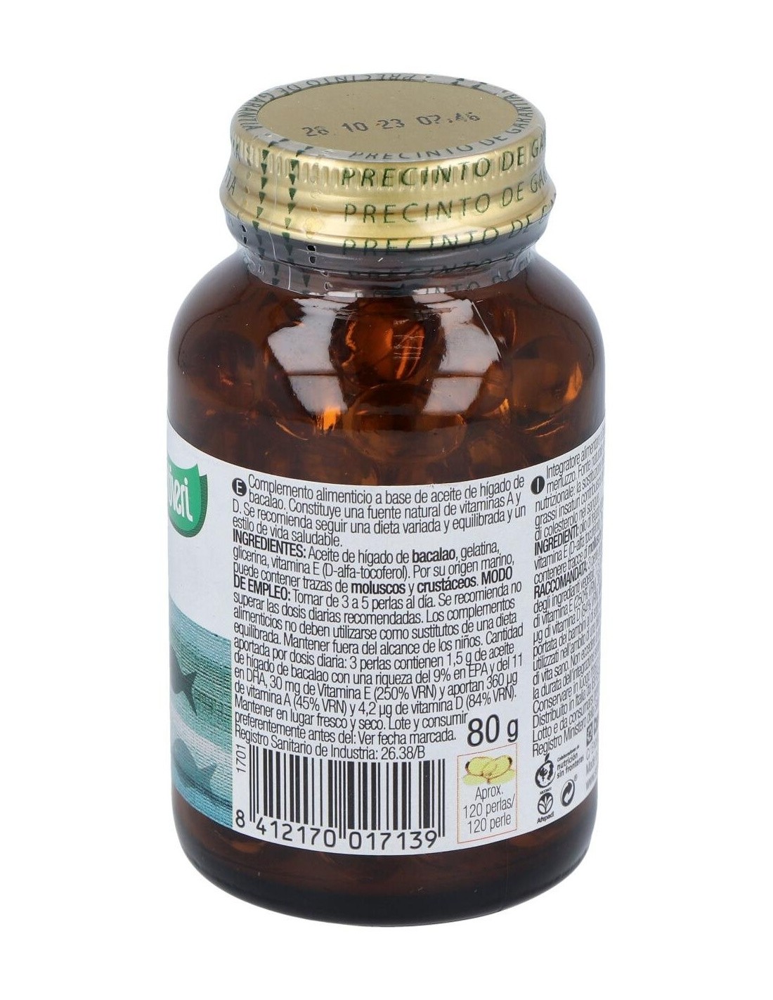 1,5 g de aceite de hígado de bacalao con una riqueza del 9% en EPA y del 11% en DHA, 30 mg de vitamina E (250% VRN) y aportan 360 µg de vitamina A (45% VRN) y 4,2 µg de vitamina D