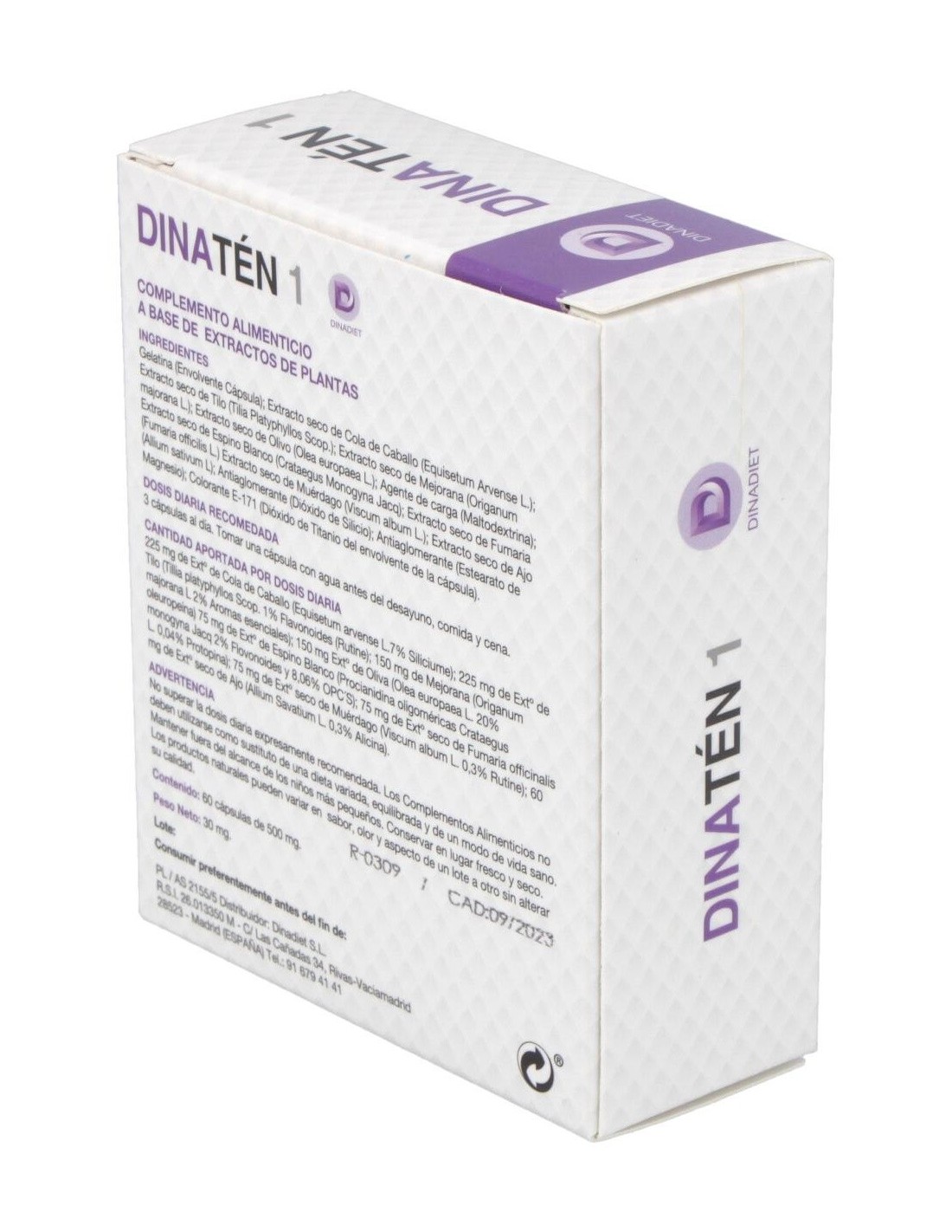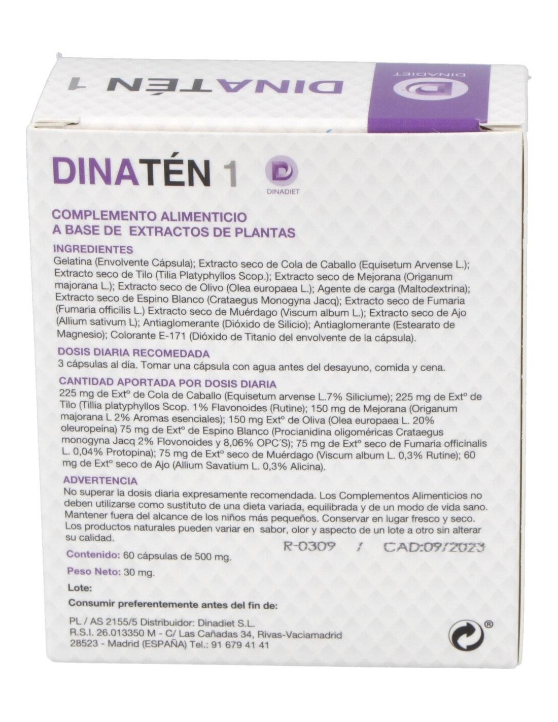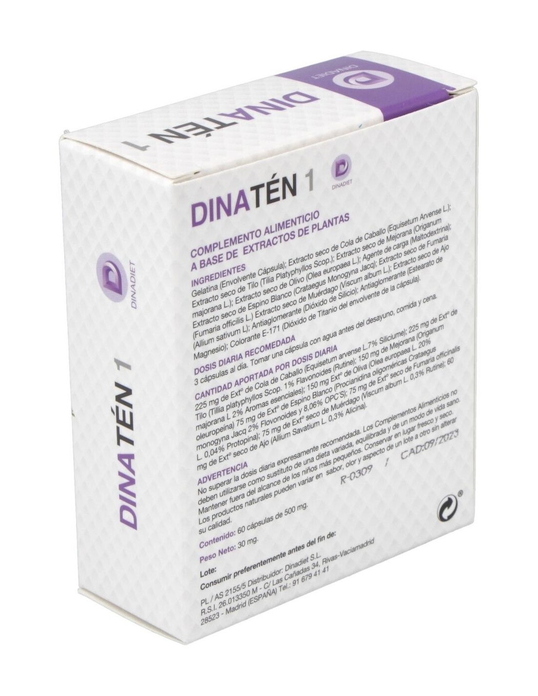 Dinadiet Dinaten es un complemento alimenticio, formulado a base de plantas naturales, muy beneficioso para regular el sistema circulatorio y la actividad del corazón. Gracias a la acción del espino blanco contribuye a mejorar la tensión arterial baja, evitando que sufras mareos y agotamiento constante.