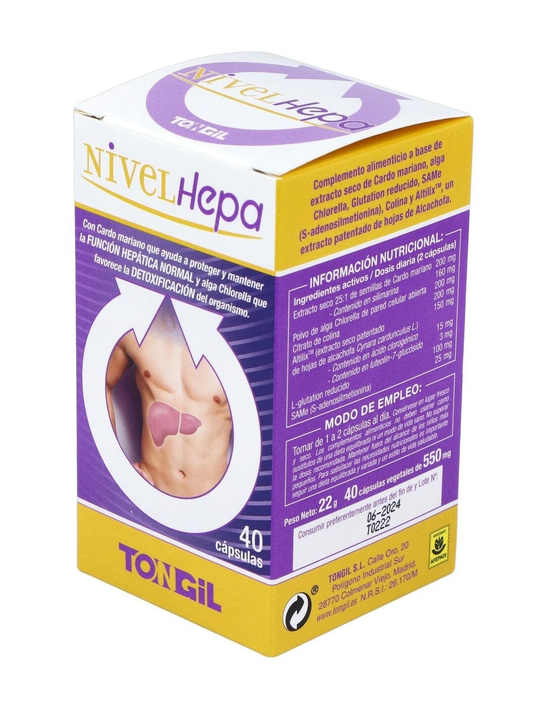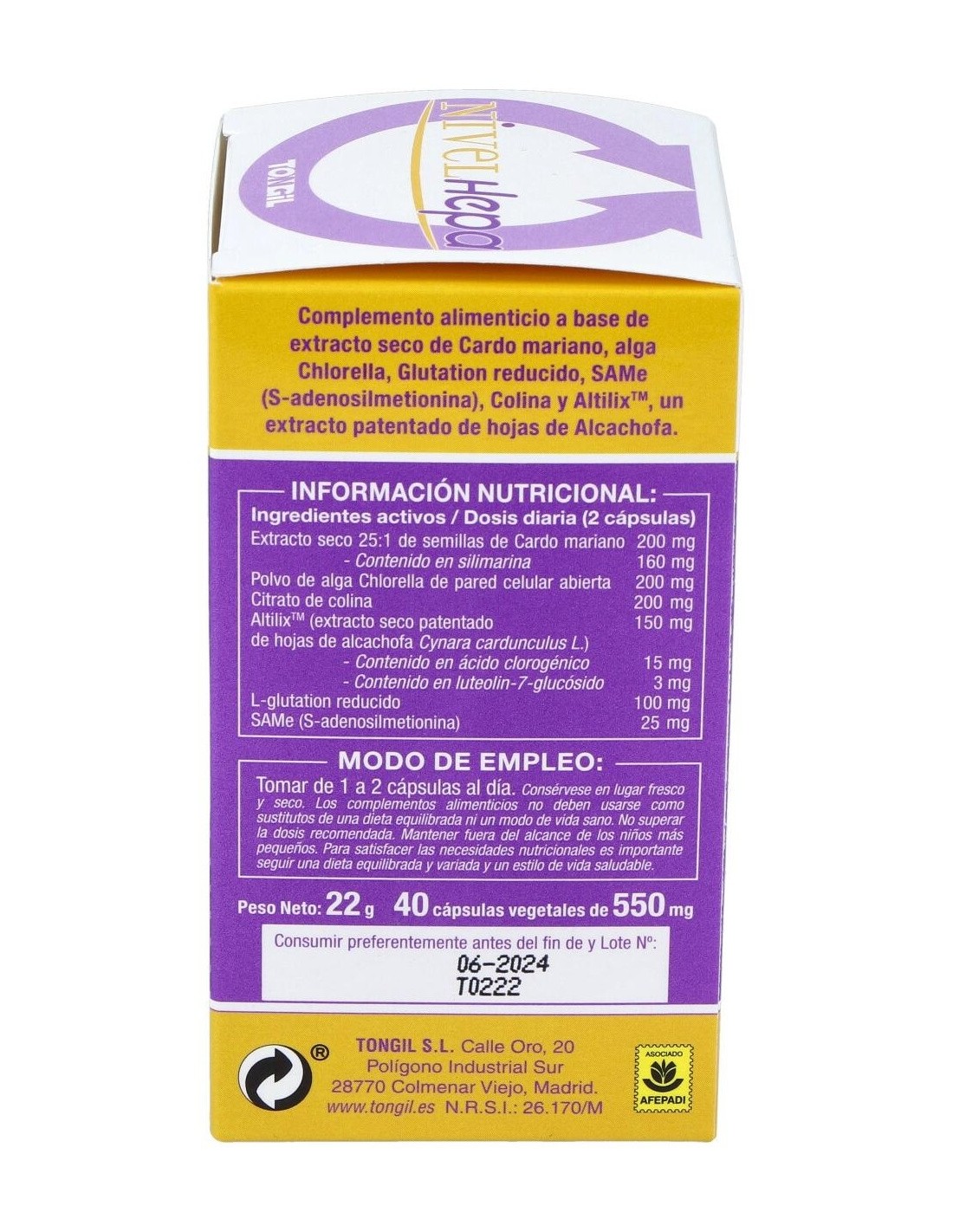 Extracto seco 25:1 de semillas de Cardo mariano (Silybum marianum) estandarizado al 80% en silimarina 100 mg, polvo de alga Chlorella de pared celular abierta (Chlorella vulgaris) (Contiene sulfitos) 100 mg, citrato de colina 100 mg, cápsula vegetal, AltilixTM (extracto seco patentado de hojas de alcachofa (Cynara cardunculus L.) estandarizado al 10% en ácido clorogénico y al 2% en luteolin-7-glucósido, maltodextrina) 75 mg, L-glutation 50 mg y SAMe (S-adenosilmetionina) 12,5 mg (procedente de S-adenosilmetionina disulfato p-toluensulfonato, estabilizante: cloruro de calcio, corrector de acidez: óxido de calcio)