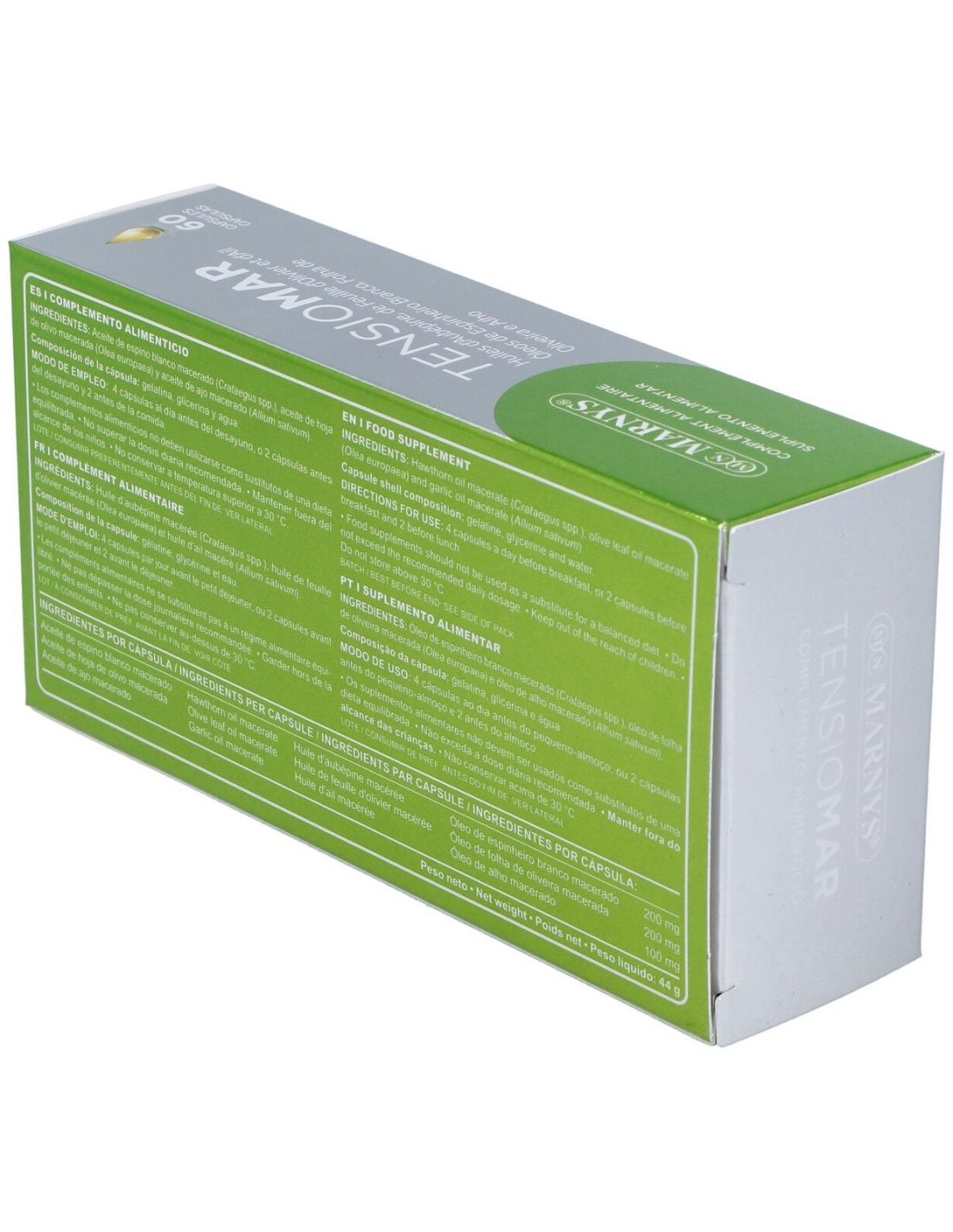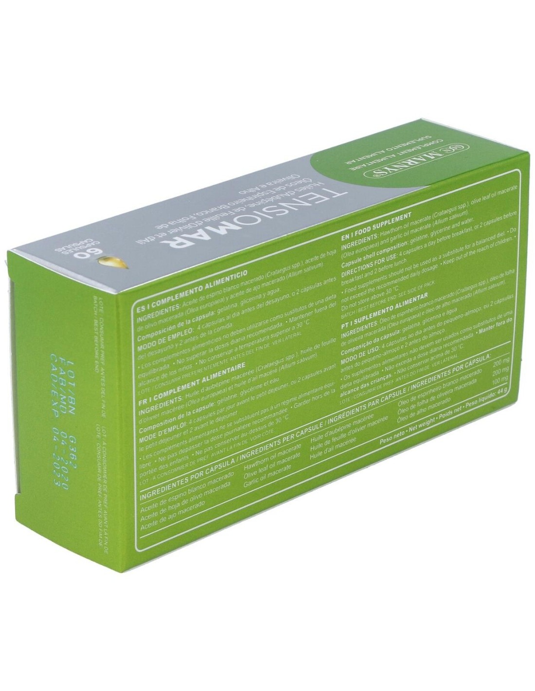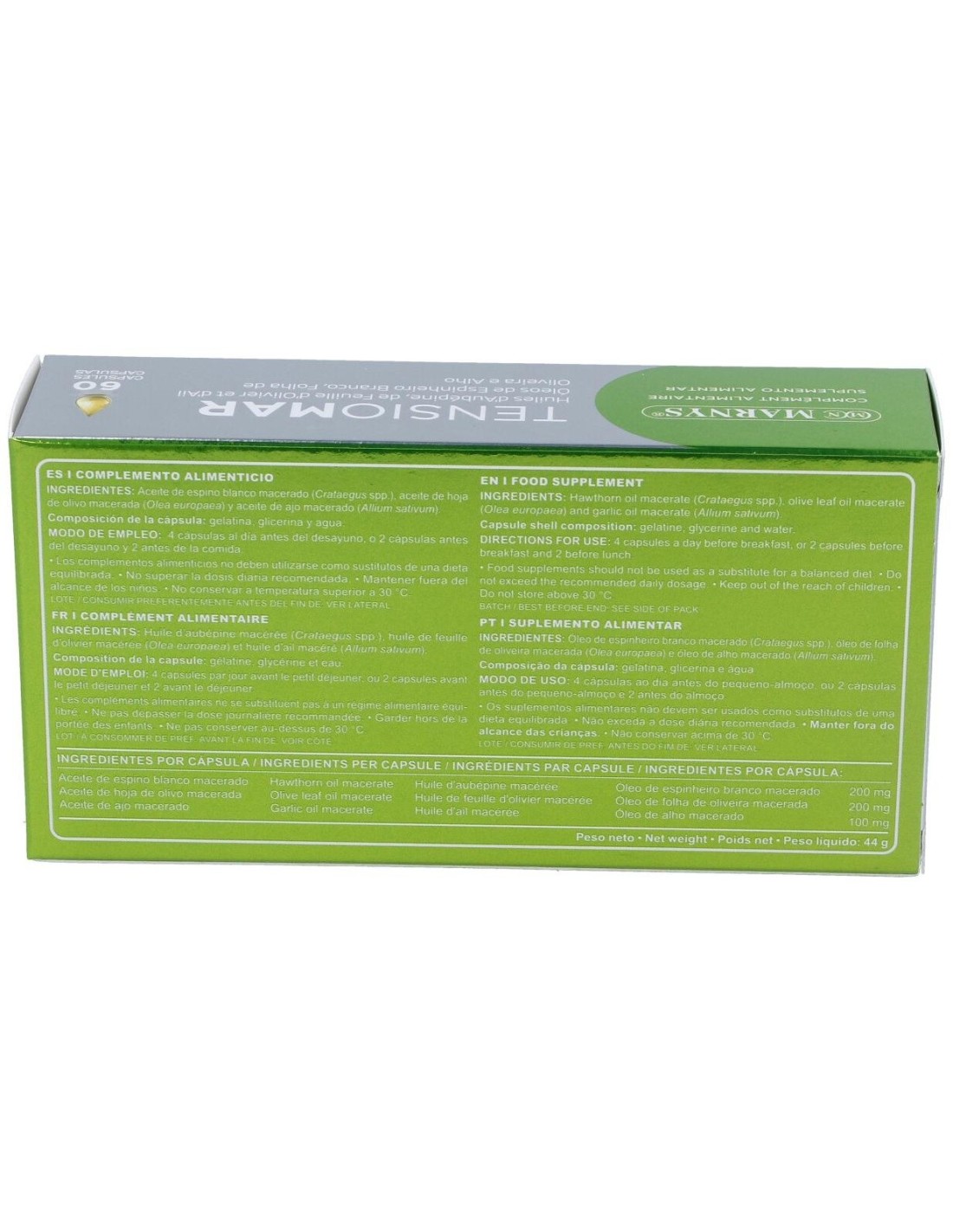 Complemento alimenticio de cápsulas blandas con aceites y soluciones oleosas de plantas tradicionales, a base de Espino Blanco, Olivo y Ajo, los cuales contribuyen a mantener la tensión en niveles normales.