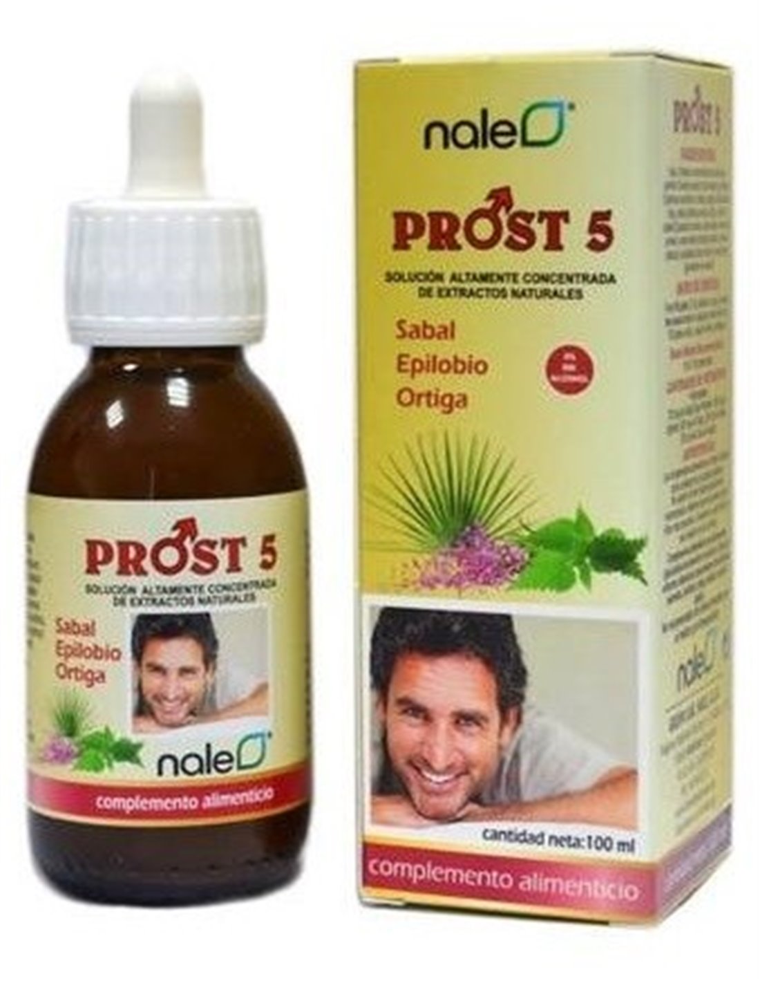 Agua, Extractos concentrados de sabal (saw palmetto (Serenoa repens, fruto maduro)) 720 mg, epilobio (Epilobium parviflorum, hierba) 600 mg, ortiga (Urtica dioica, hoja) 600 mg, abedul (Betula pendula, hoja) 300 mg, y cola de caballo (Equisetum arvense, parte aérea) 300 mg, aroma de pomelo, conservantes (benzoato sódico, sorbato potásico), acidulante (ácido cítrico) y edulcorante (glucósidos de esteviol).\ \ \ Por 6 ml:\ 720 mg de Sabal (Saw Palmetto), 600 mg de Epilobio, 600 mg de Ortiga, 300 mg de Abedul, 300 mg de Cola de Caballo.