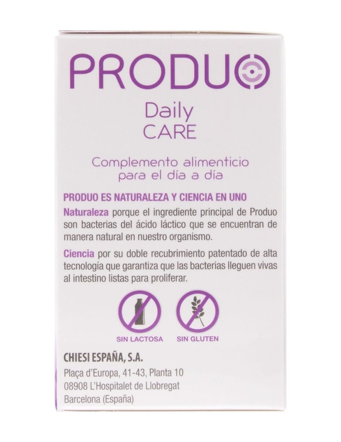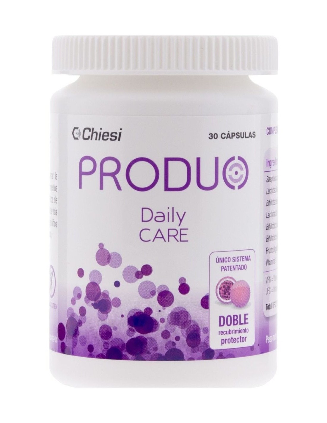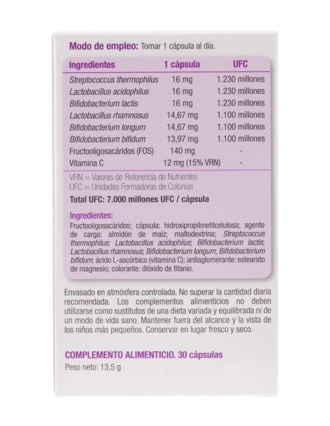 Complemento alimenticio a base de microorganismos, Lactobacilos y Bifidobacterias, que ayudan a mantener el equilibrio de la flora intestinal. Por su tecnología patentada de doble recubrimiento protector, garantiza una supervivencia 100 veces superior a la de los microorganismos sin recubrir, incrementando el número de ellos que llegan al intestino. Además vitamina C que contribuye a la función normal del sistema inmune.
