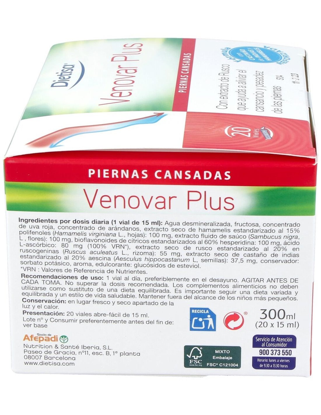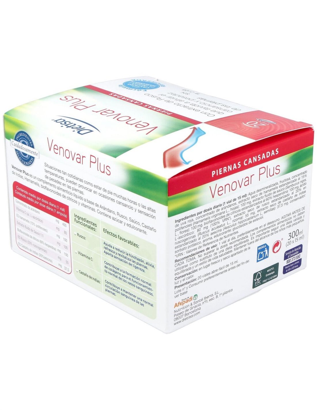 Agua desmineralizada, fructosa, concentrado de uva roja, concentrado de arándanos, extracto seco de hamamelis estandarizado al 15% polifenoles (Hamamelis virginiana L. hojas), extracto fluido de saúco (Sambucus nigra L. flores), bioflavonoides de cítricos estandarizados al 60% hesperidina, ácido L ascórbico, extracto seco de rusco estandarizado al 20% ruscogeninas (Ruscus aculeatus L. rizoma), extracto seco de castaño de Indias estandarizado al 20% aescina (Aesculus hippocastanum L. semillas), conservador: sorbato potásico, aroma, edulcorante: glucósidos de esteviol.