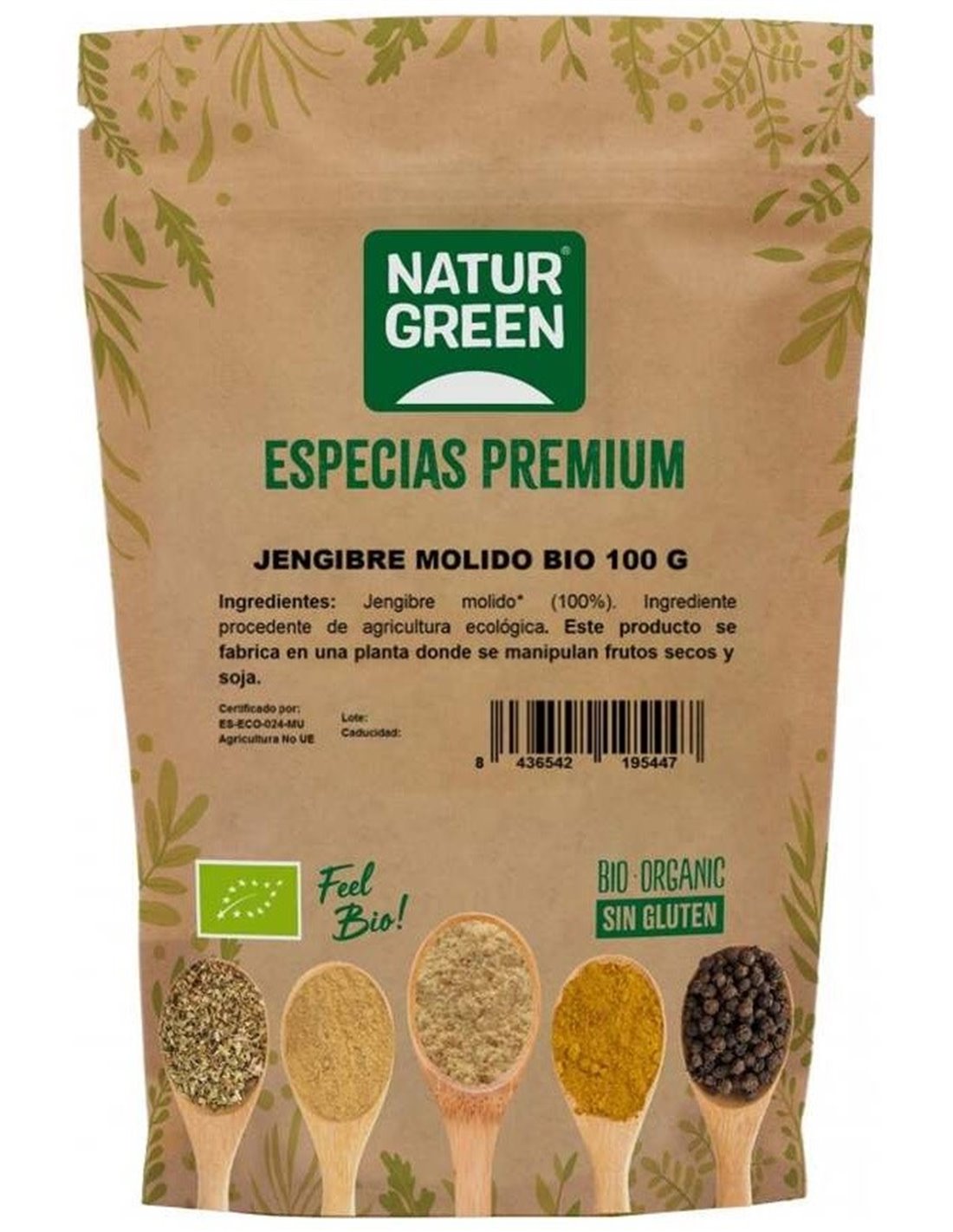 Jengibre molido ecológico. 100% vegetal Sin lactosa, Sin azúcares, Sin azúcares añadidos, Sin gluten, Sin huevo, Sin proteína láctea.