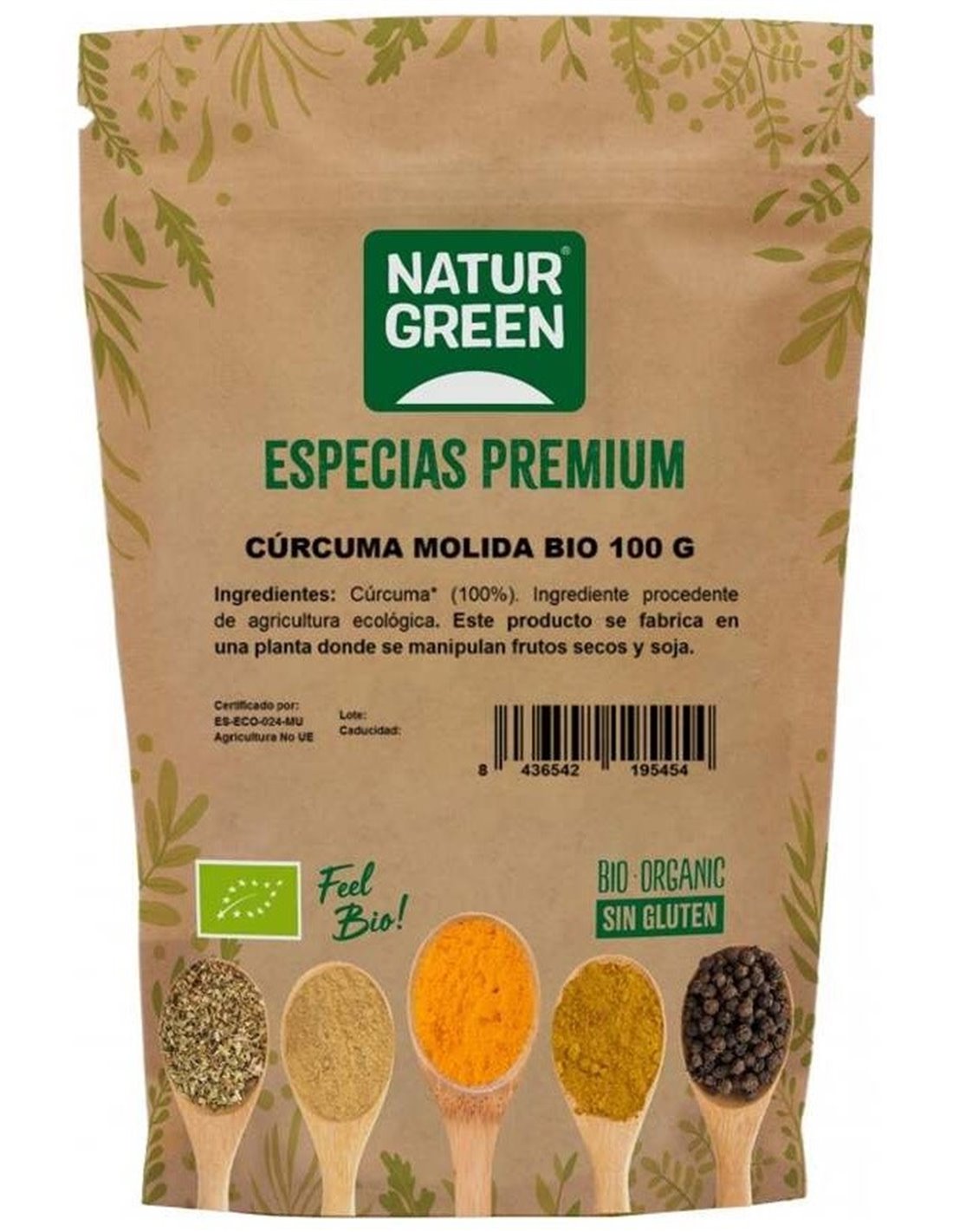 Cúrcuma molida ecológica. 100% vegetal Sin lactosa, Sin azúcares, Sin azúcares añadidos, Sin gluten, Sin huevo, Sin proteína láctea.