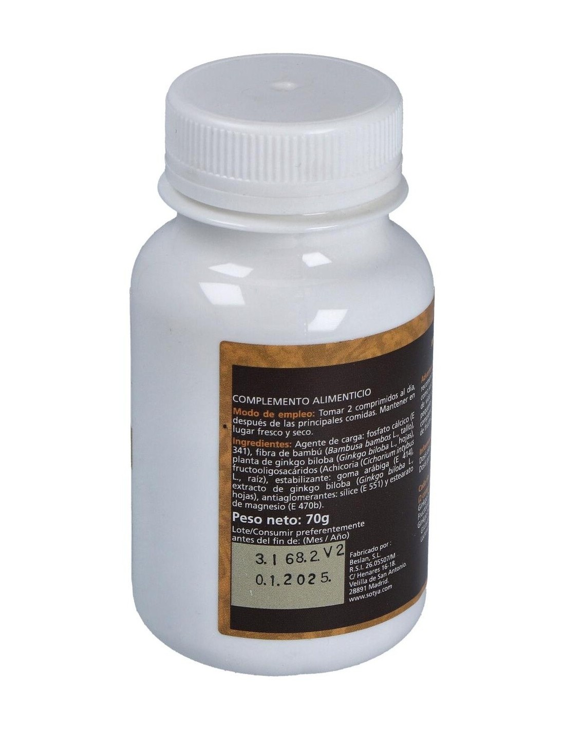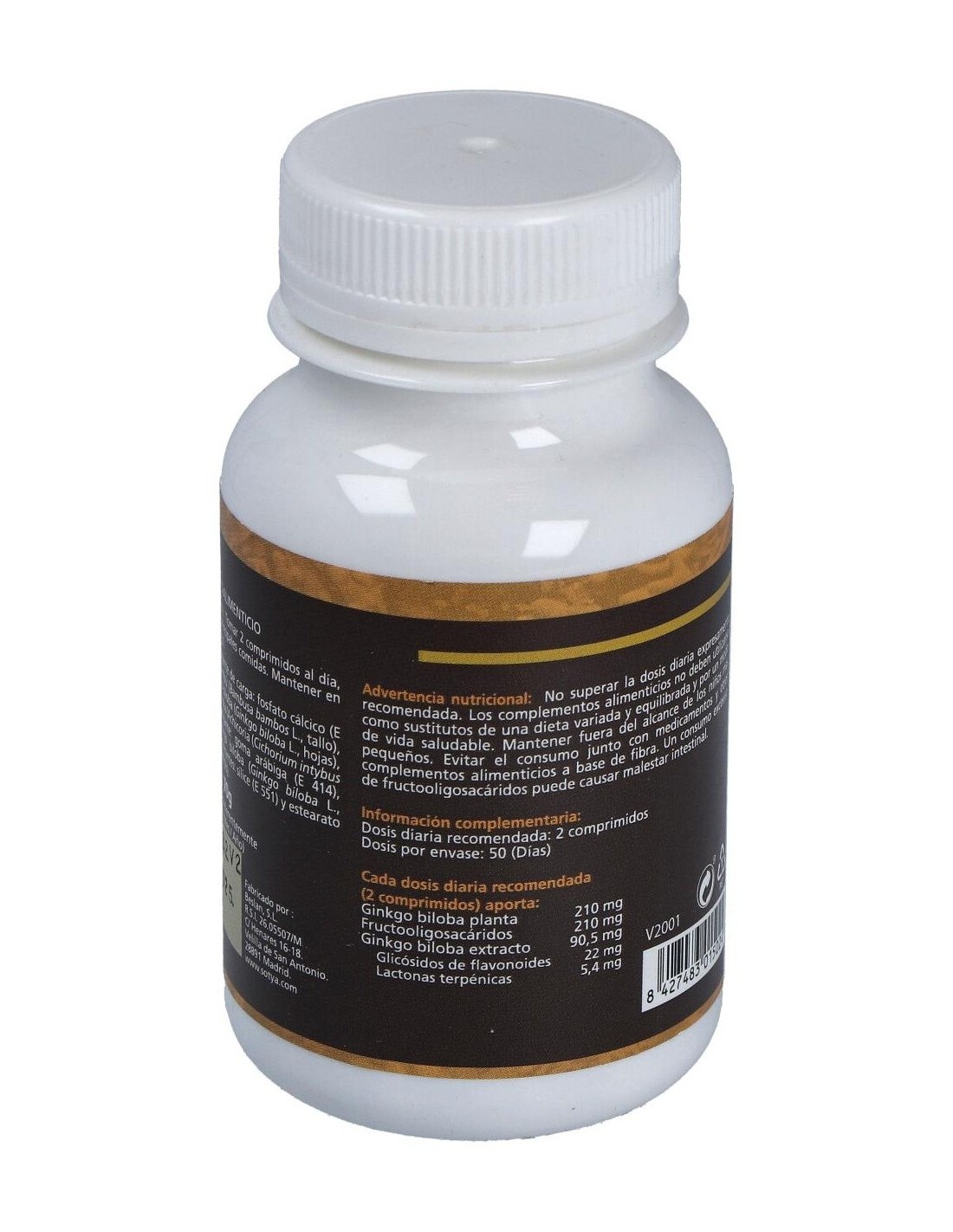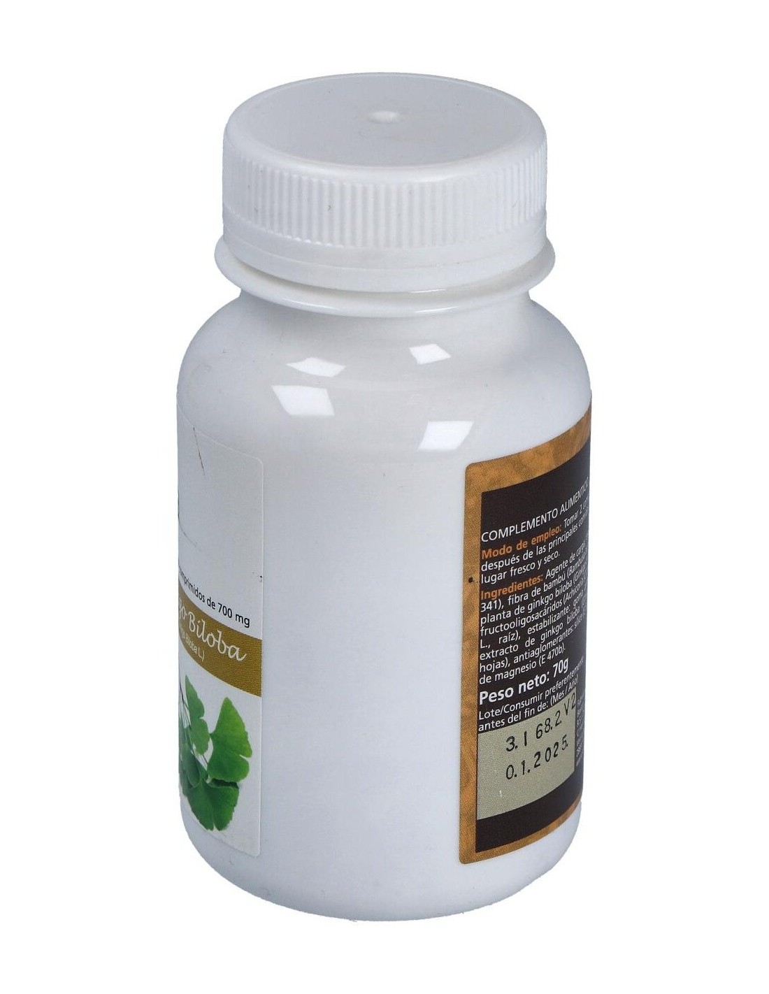 Complemento alimentcio a base de Ginkgo Biloba. Las hojas de ginkgo son ricas en glucósidos flavonoides, quercitina, luteolina, catequinas, resina, aceite esencial, terpenos y lípidos. Estas sustancias actúan en el sistema circulatorio tratando problemas vasculares y trastornos circulatorios (gran vasodilatador periférico, cerebral y antiespasmódico). Ayuda a disminuir la permeabilidad de los capilares, reduciendo el edema. Posee propiedades venotónicas, tonificando las paredes de las venas, y facilitando el retorno sanguíneo. En ocasiones puede aparecer hipotensión, cefaleas, urticaria. No tomar embarazadas y lactantes. Interacciones con heparina, anticoagulantes orales y antiagregantes plaquetarios.